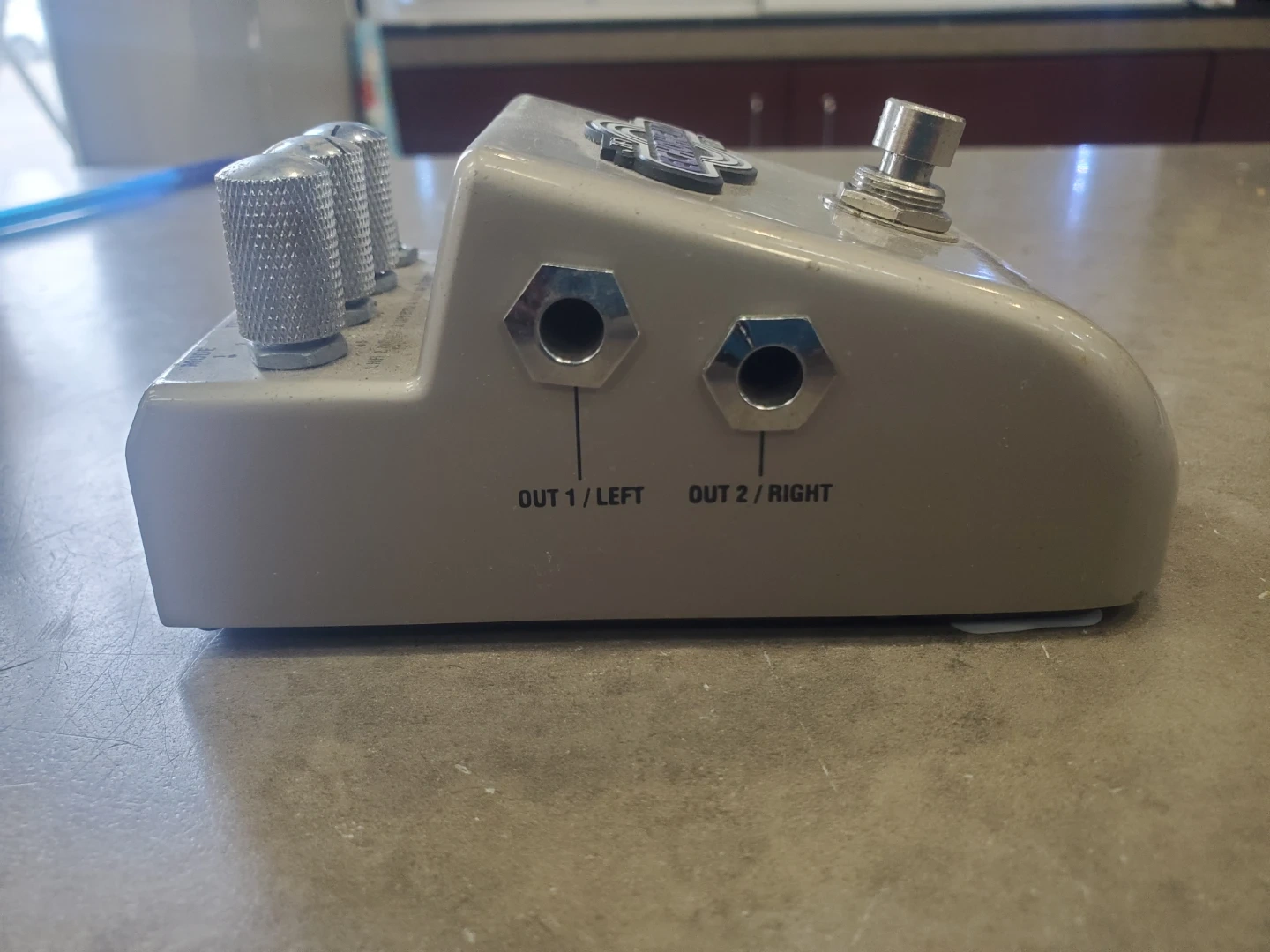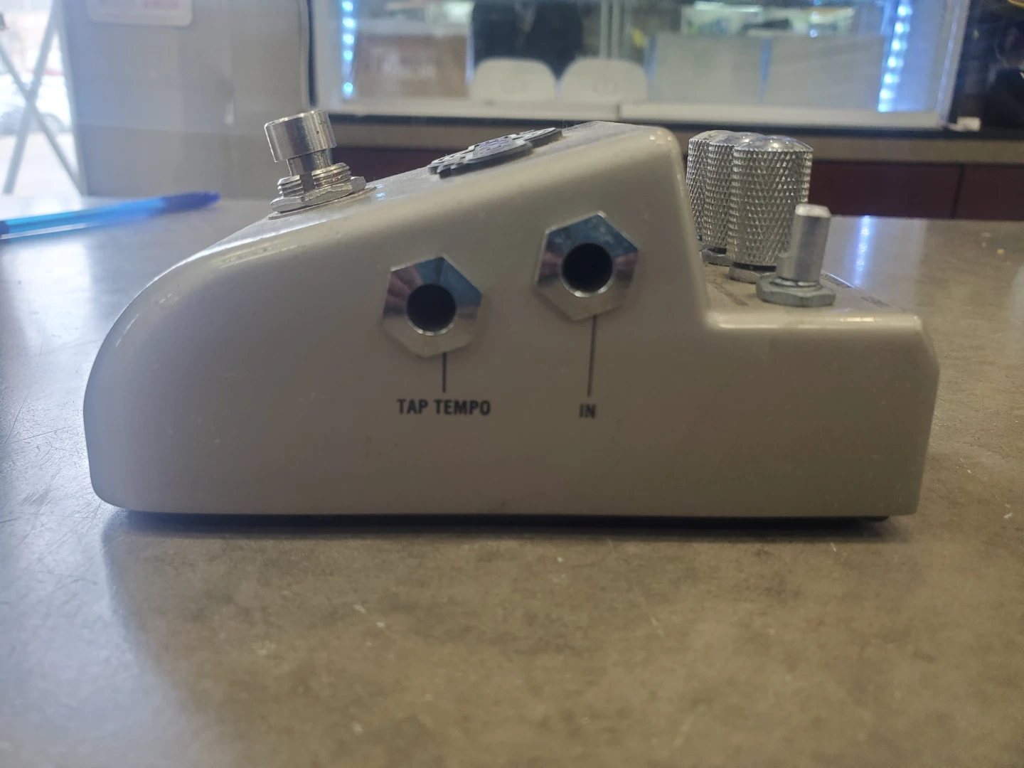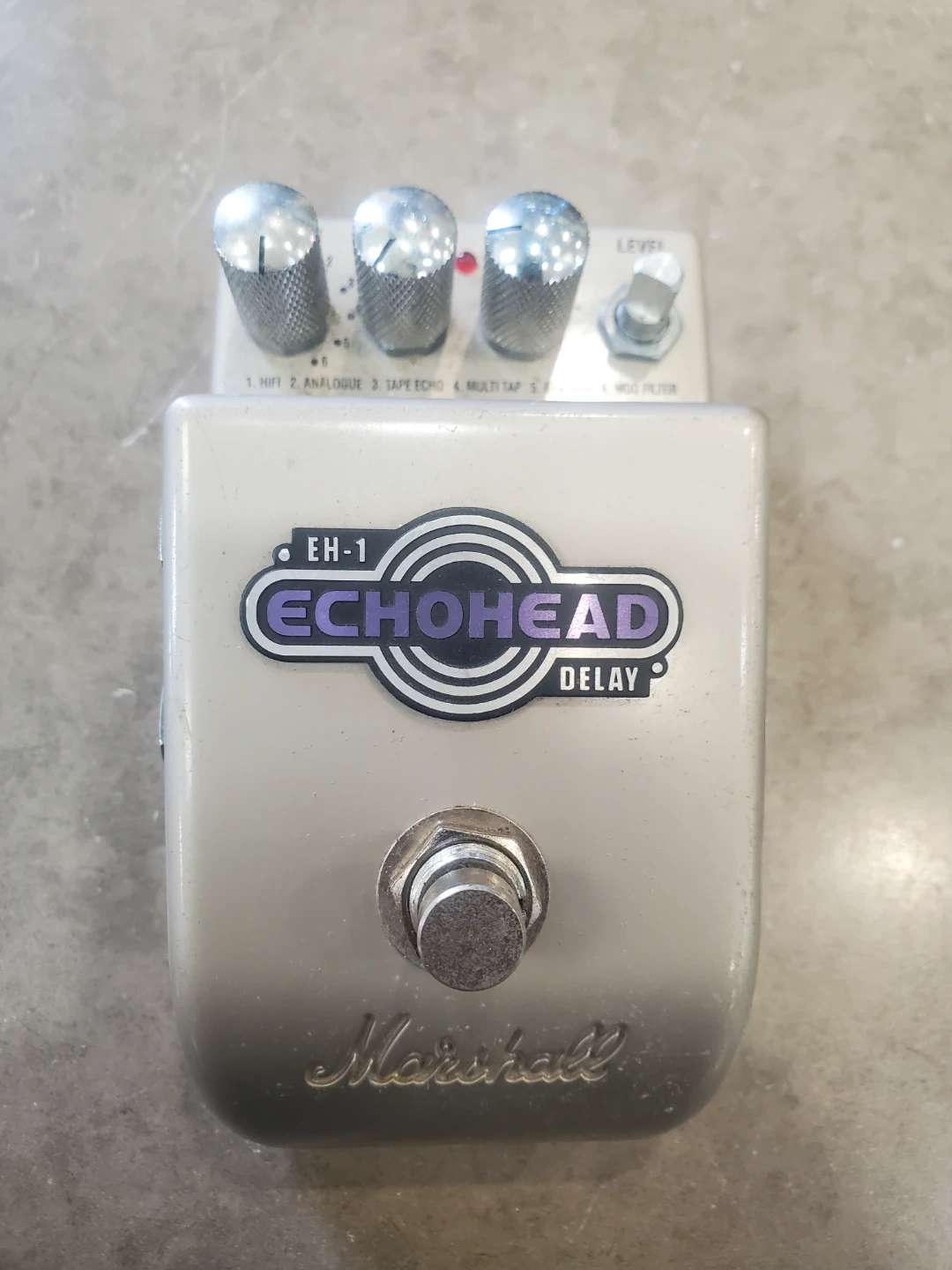 Marshall Echohead delay pedal, model EH-1. It's a compact effects unit for guitarists. This pedal offers multiple delay modes.Missing one knobs.