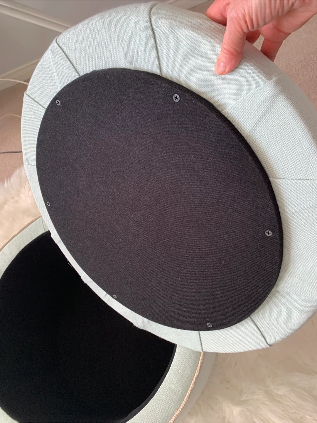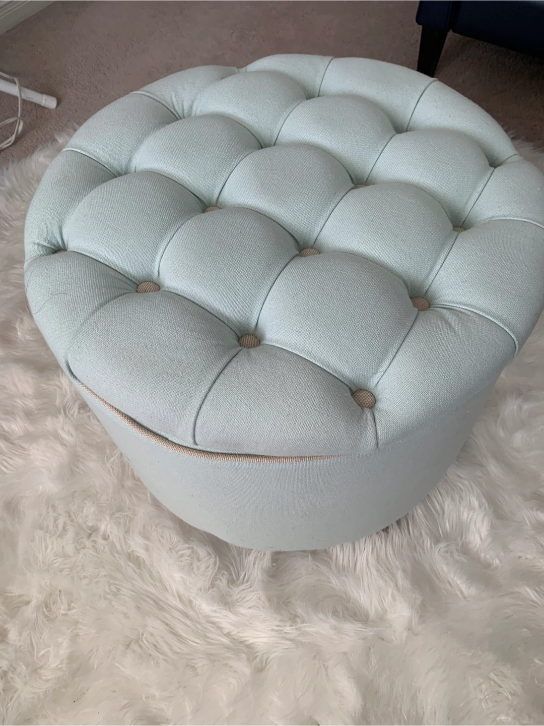 Mint Green upholstered ottoman with tufted top and storage inside. It has wooden legs and a fabric lining. This piece is great for adding extra seating or storage in any room! Nice and sturdy. 20 inches in diameter 18 inches tall. Pick up Georgetown South.