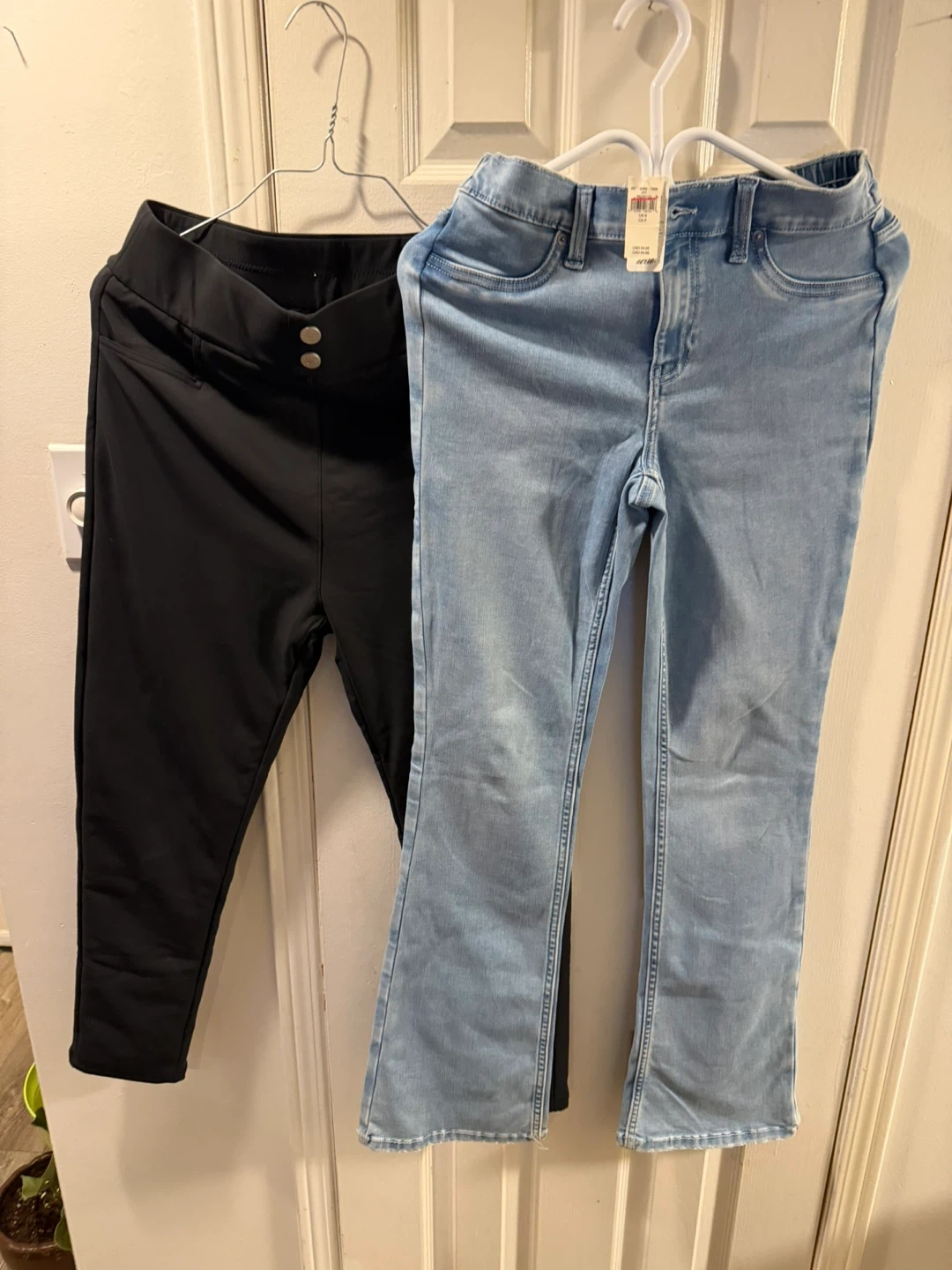 Bundle includes a pair of light wash Aerie jeans and a pair of black pull-on pants. Jeans are size S with an elastic waistband. Black pants have a satin lining and a button closure. Great for casual wear or dressing up!