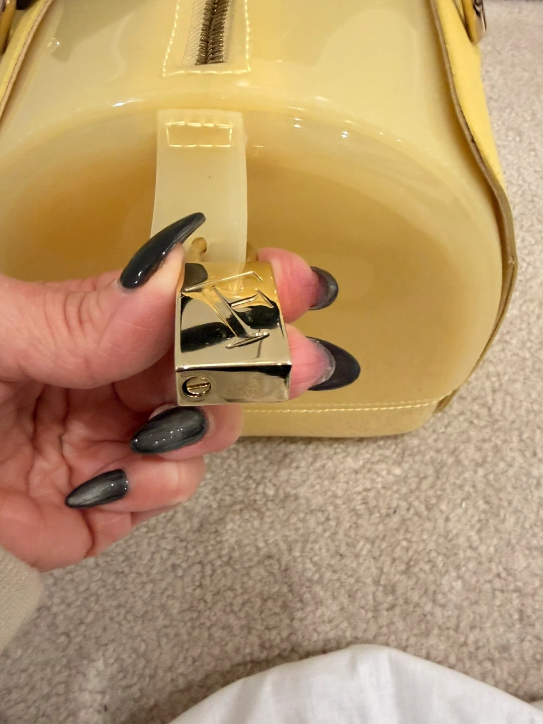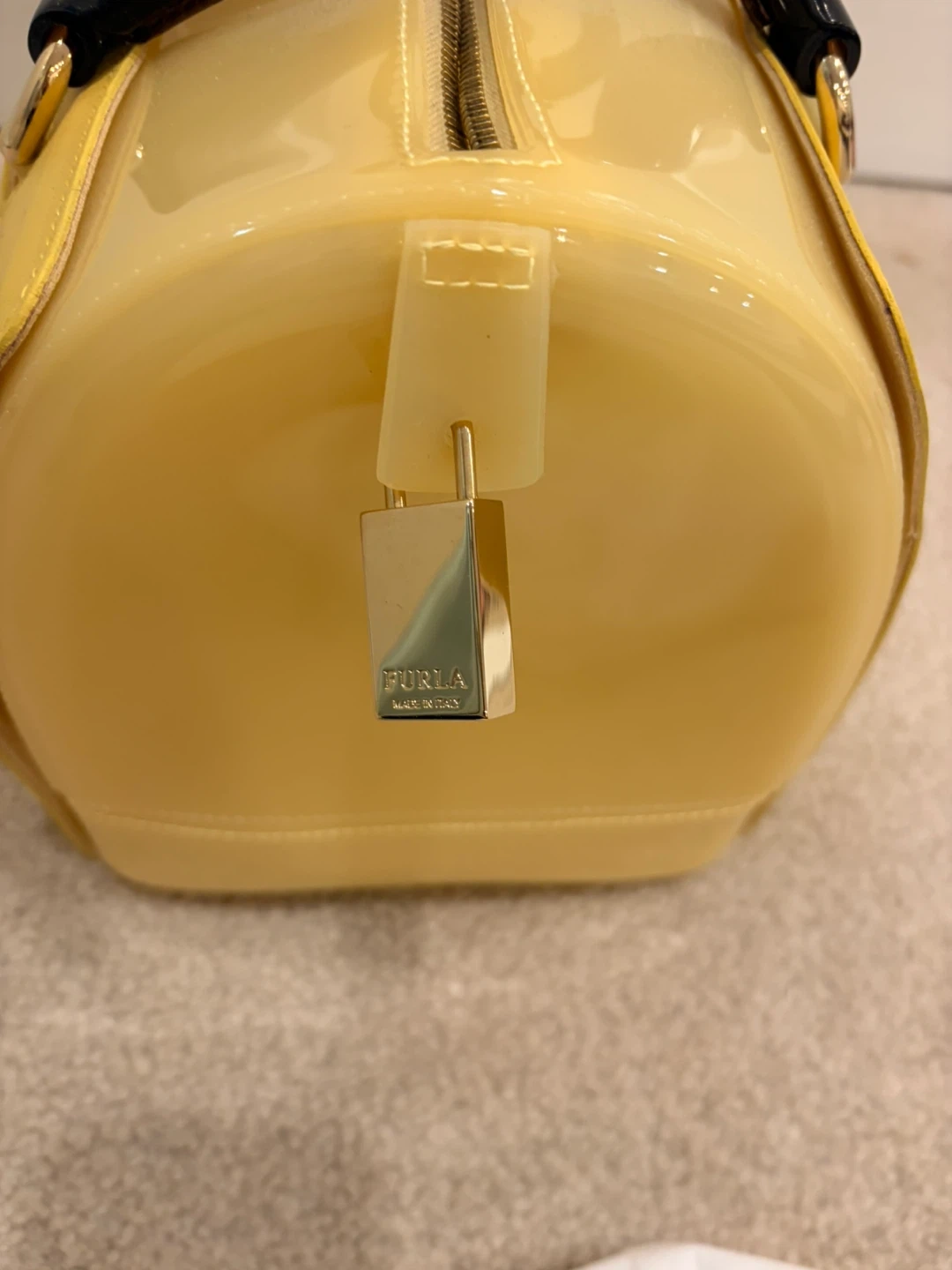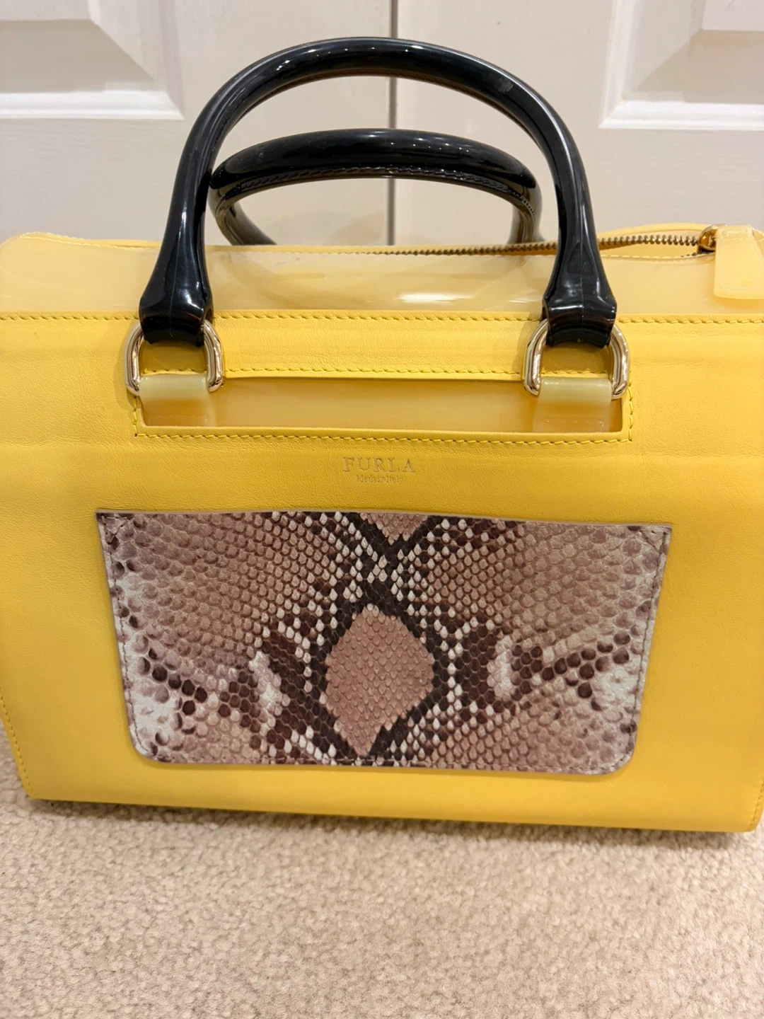 This is a Furla Candy satchel in yellow rubber and snakeskin-embossed leather