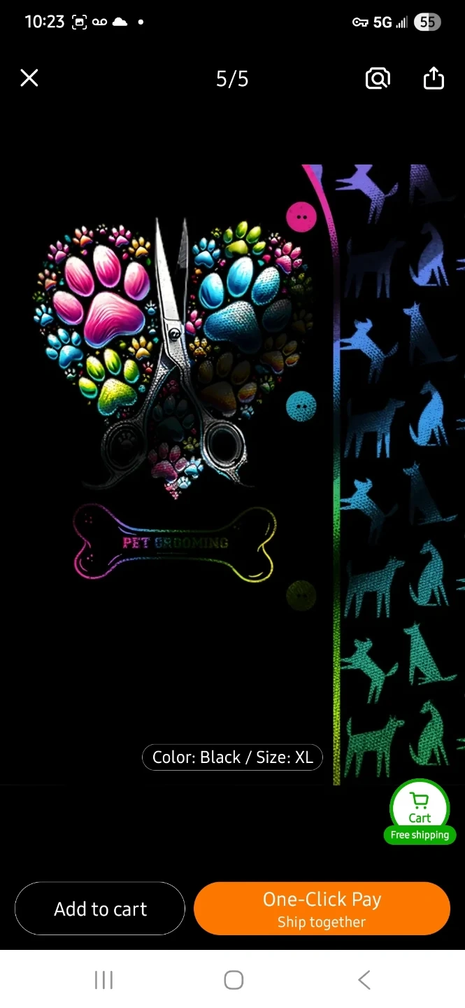 This t-shirt features a colourful paw print and scissor graphic with 'Pet Grooming' text. It's made of a comfortable material and comes in black. It has a button closure.