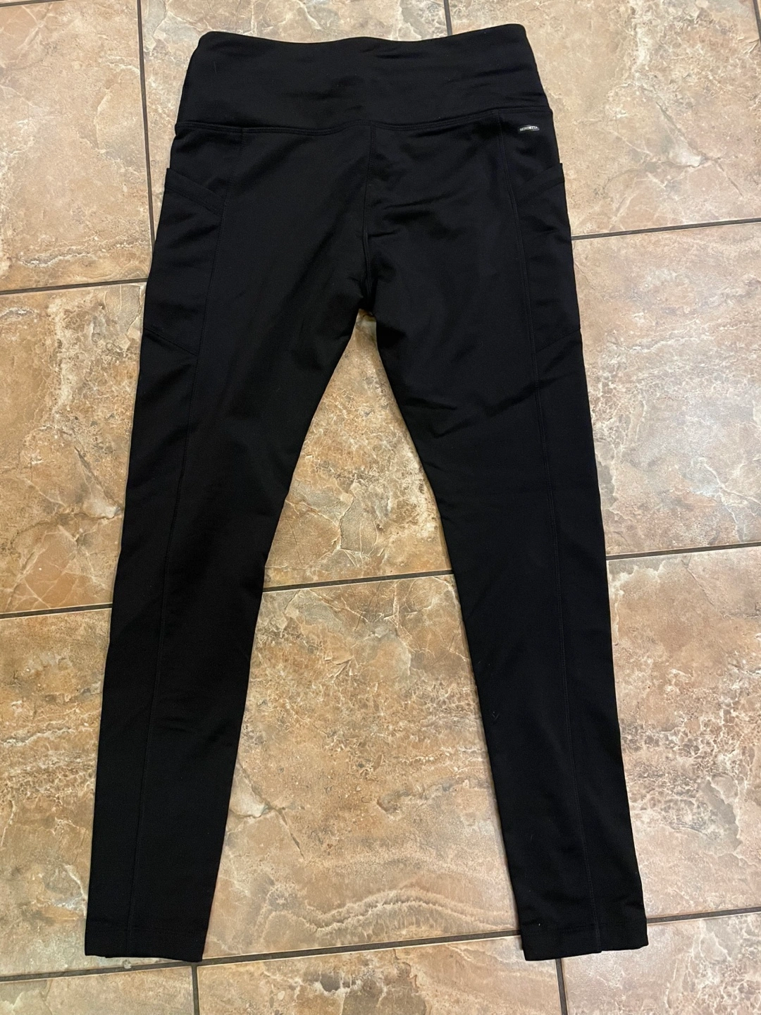 Women's Mondetta fleece lined black athletic leggings. High-waisted with pockets, and drawstring waist.