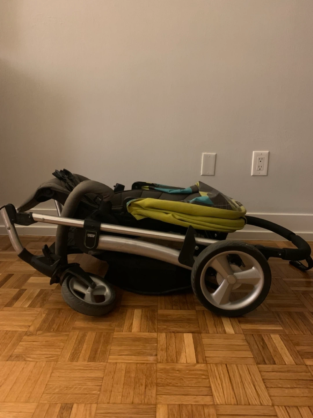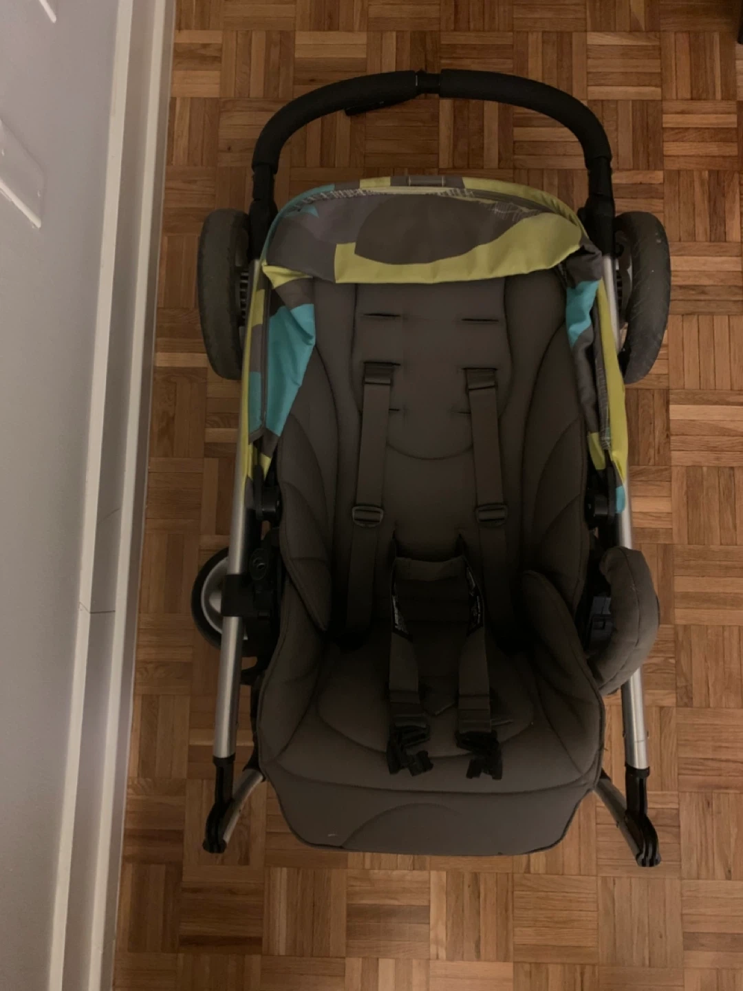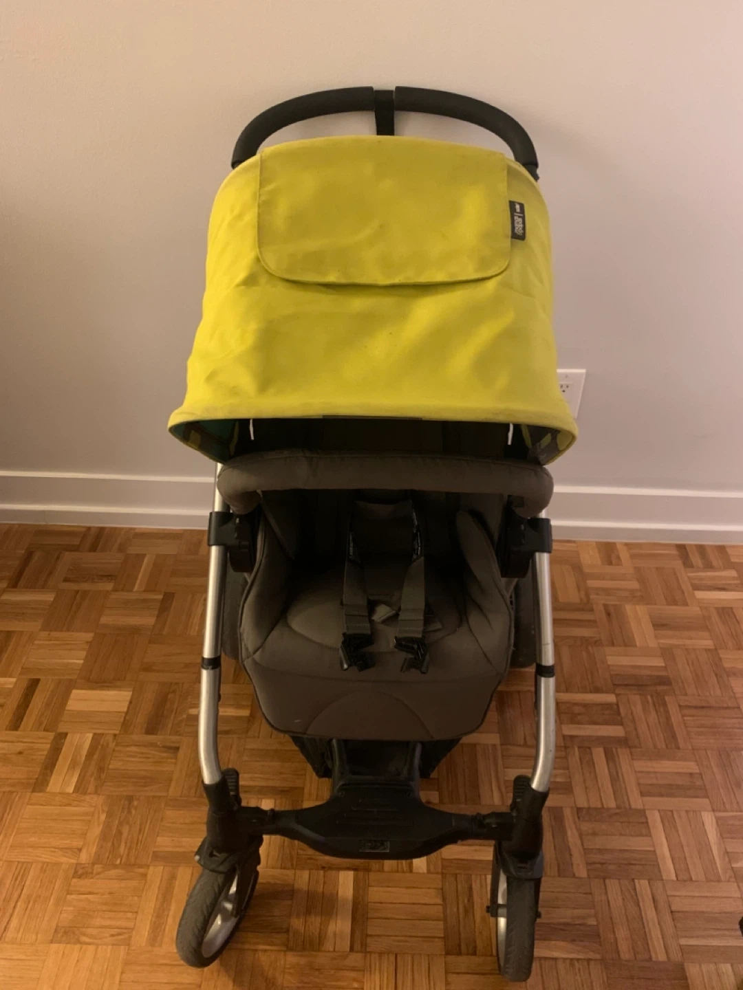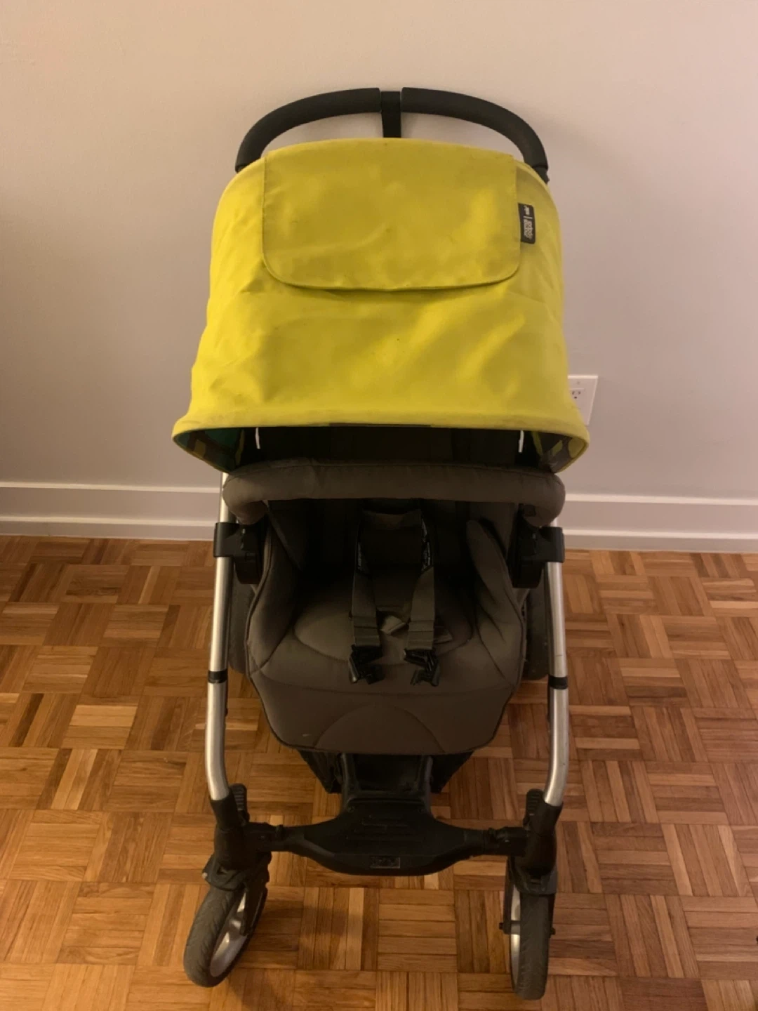 A Mamas & Papas Sola stroller in grey and lime green. It features a five-point harness and a removable bumper bar. This stroller is suitable for use from 1 year. It needs new belt