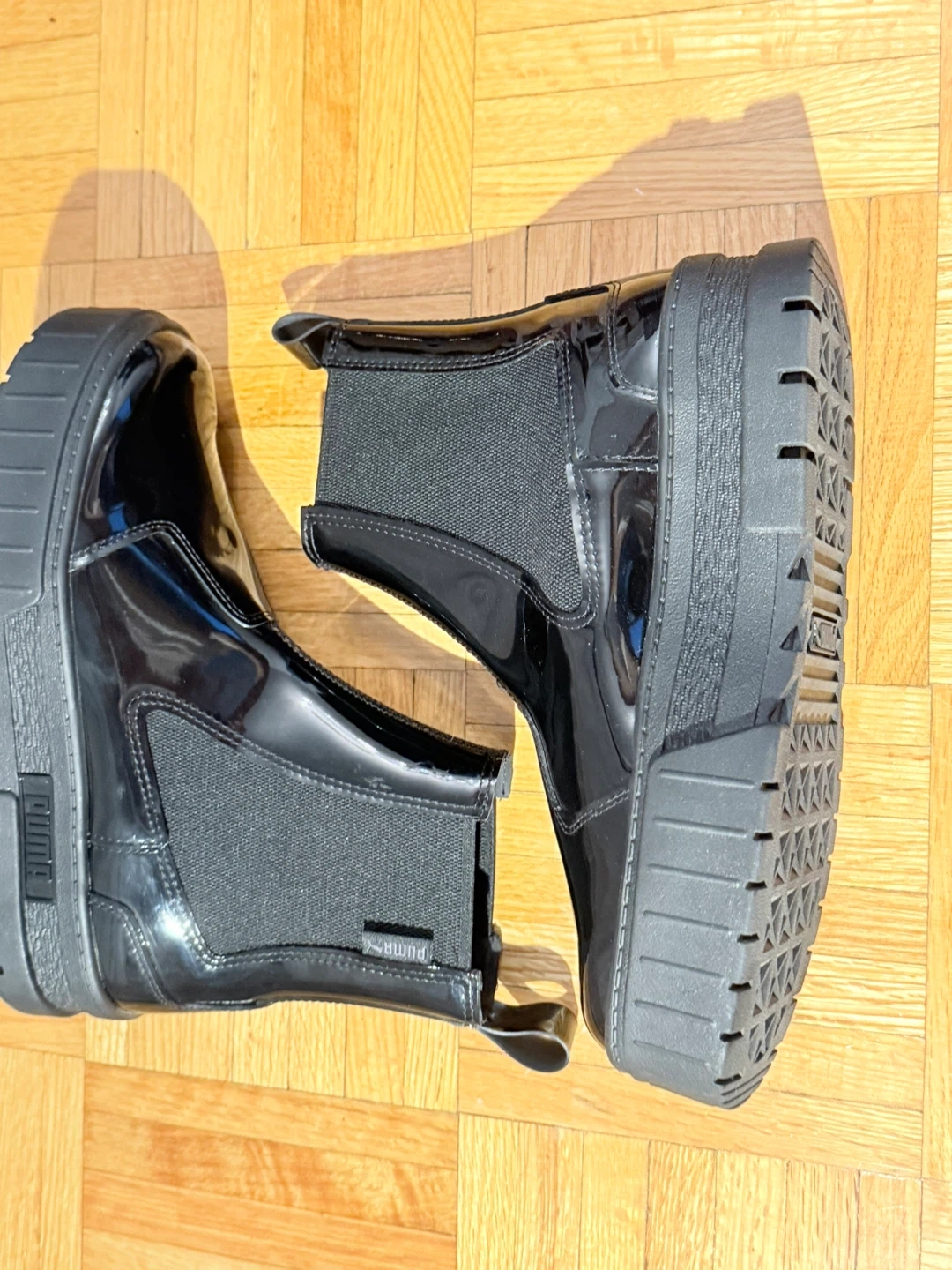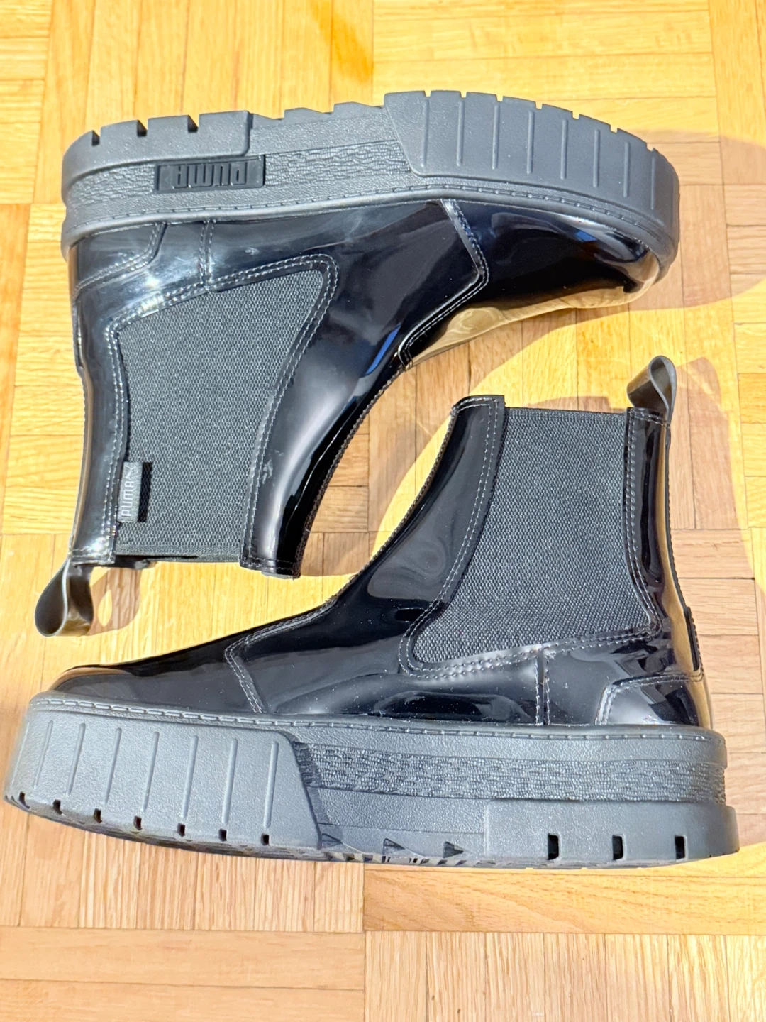 Selling a pair of Puma Mayze Chelsea Gloss women's boots in size 7.5. These stylish black boots feature a sleek, glossy finish and a comfortable Chelsea boot design. Perfect for adding a touch of edge to any outfit!