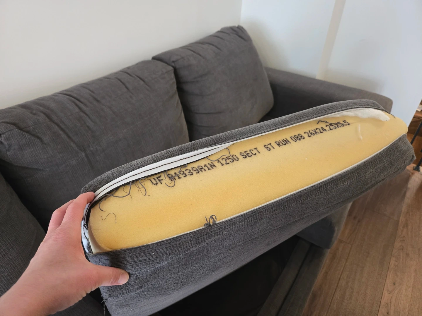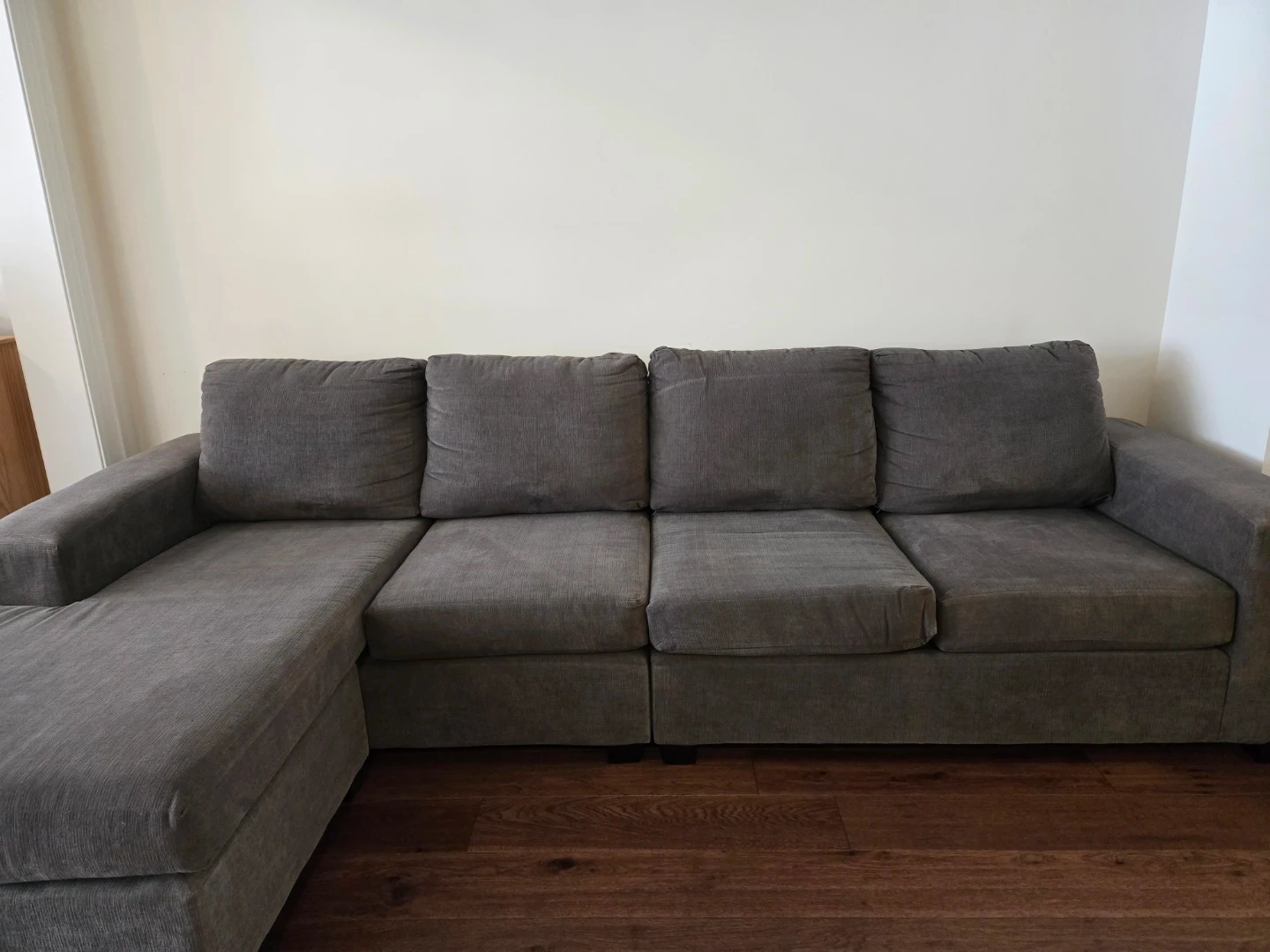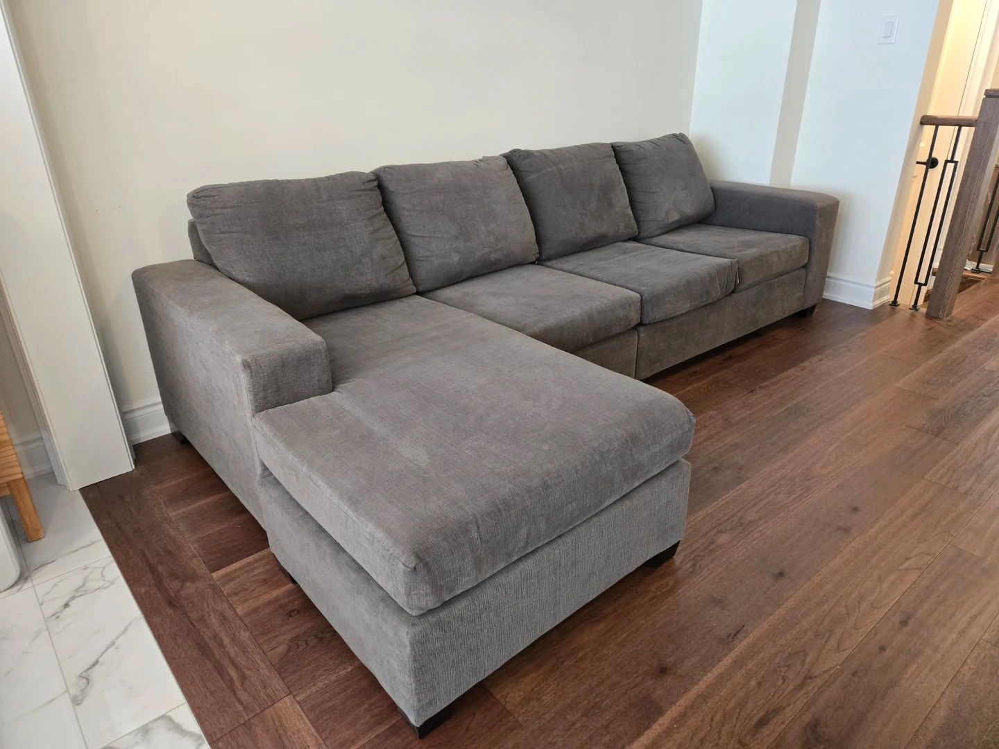Grey sectional sofa with chaise. The fabric is thick and durable, and feels nice to the touch. Thick, supportive cushions. Very comfortable.