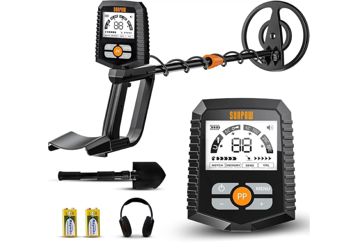 SUNPOW metal detector. Includes headphones, batteries, and a folding shovel. Features a digital display with sensitivity and volume controls.