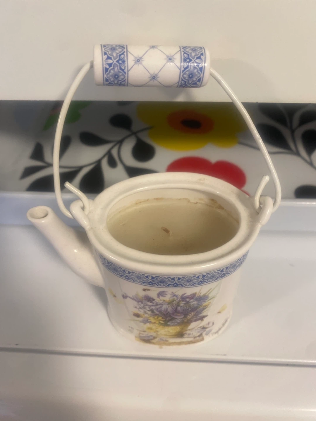 This decorative ceramic watering can features a lovely floral and bee design with a blue and white border. It has a hinged lid and a metal handle with a decorative ceramic grip. It's a charming piece for display!