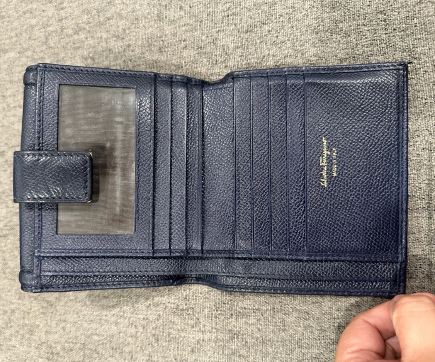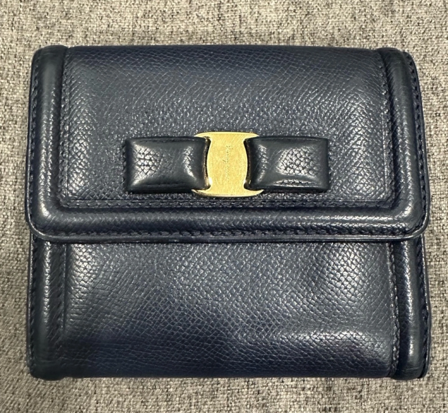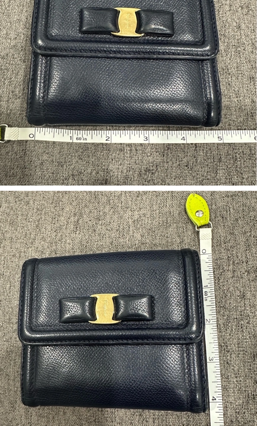 Authentic Salvatore Ferragamo in great preloved condition. No major visible flaws to mention. Only minimal signs of use but nothing major. Very minimal rubbing which is hardly noticeable, please refer to images. π― authentic, purchased from Japan. The wallet has 9 cards slots, 2 compartments for paper bills and 1 coins pocket. In color dark blue with cute vara bow in front with gold hardware Ferragamo logo. Please refer to images for measurements.