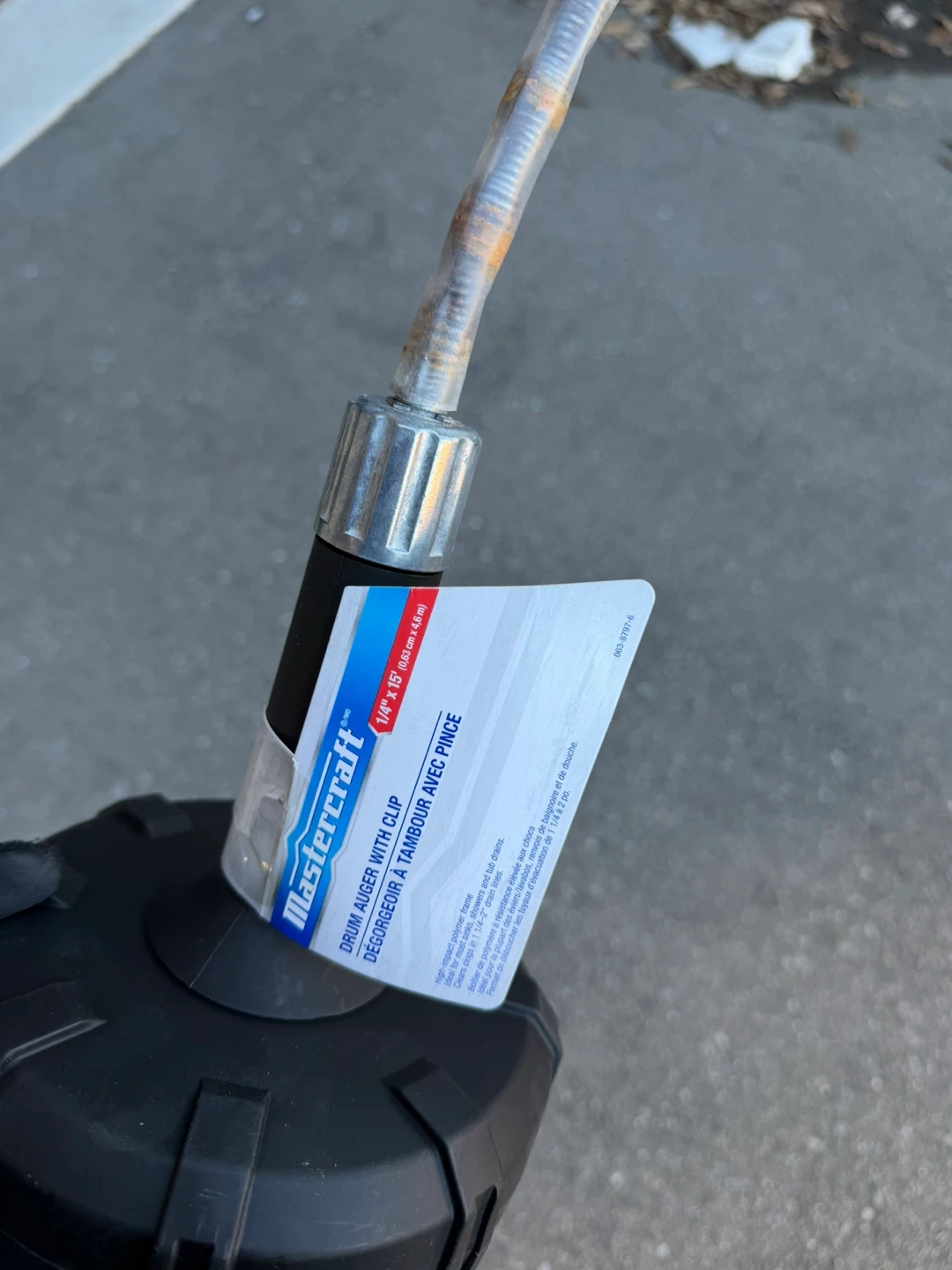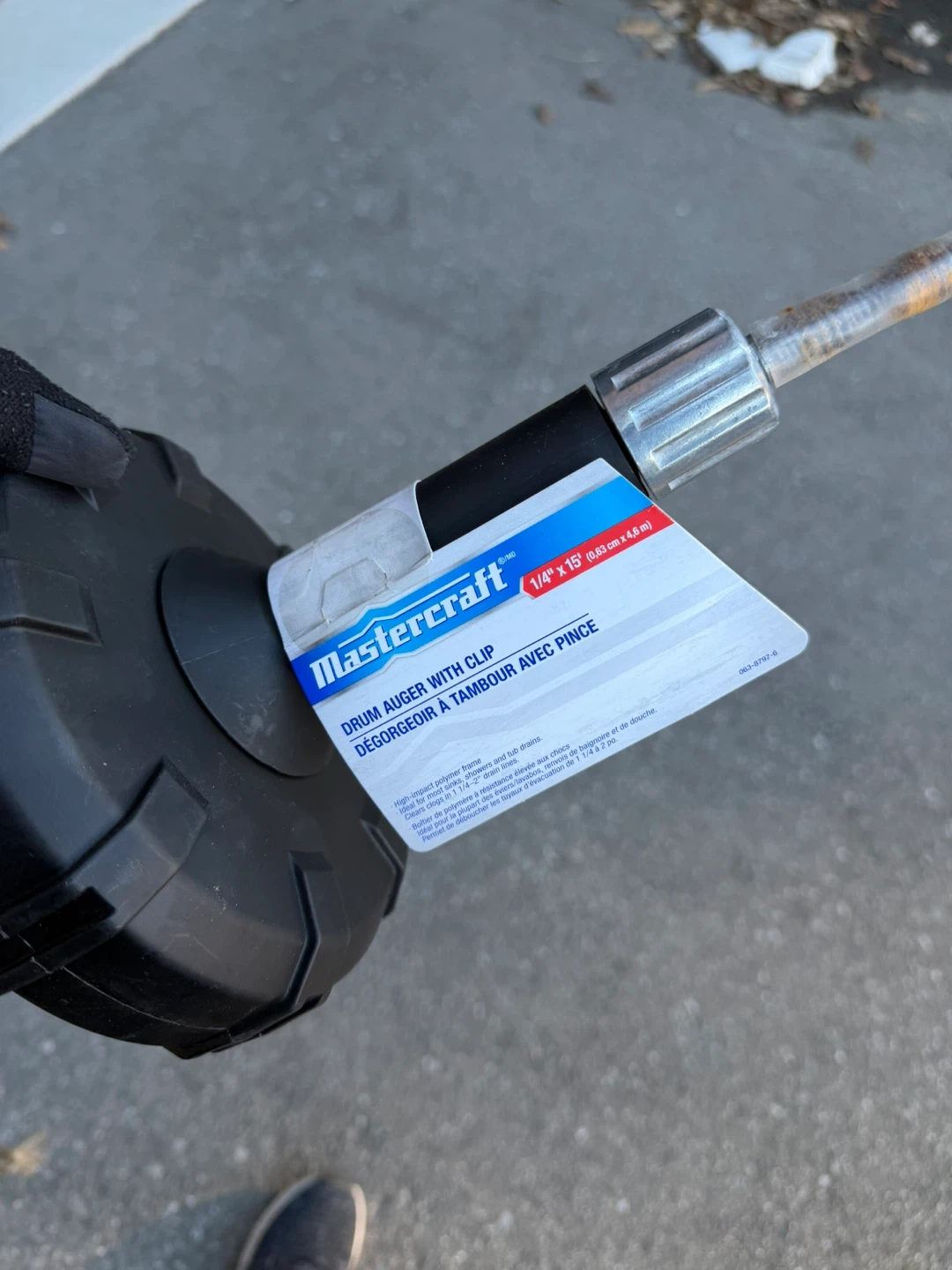 Mastercraft drum auger with clip for clearing drains. High-impact polymer body. Cable is 1/4" diameter and 15 feet long.