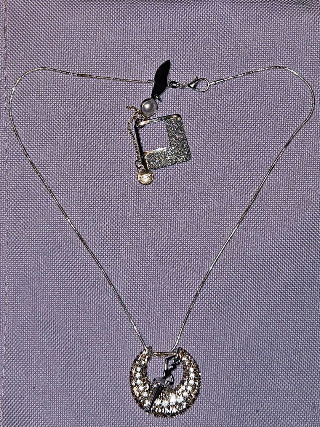 This necklace features a delicate authentic S925 Italian silver a silver ballet dancer pendant inside a sparkly, crystal-encrusted hoop. It also has a detachable square charm with a glittery finish and a small pearl accent. It's a lovely piece for any dancer or lover of unique jewellery!.