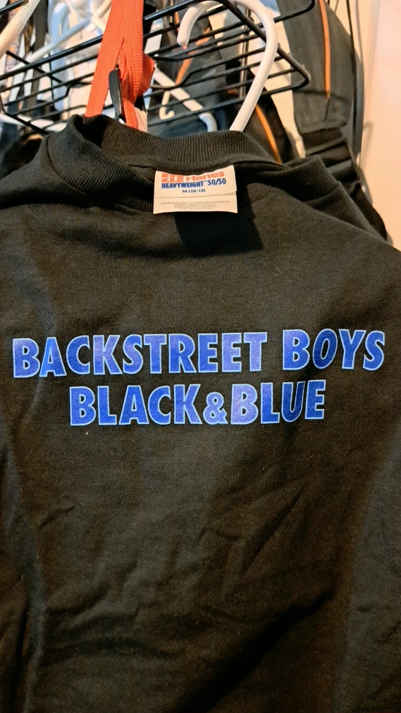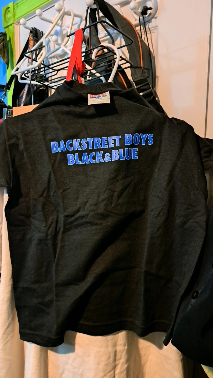 Black t-shirt featuring the Backstreet Boys 'Black & Blue' album title. This is a heavyweight 50/50 blend shirt. It's a great piece for any fan!