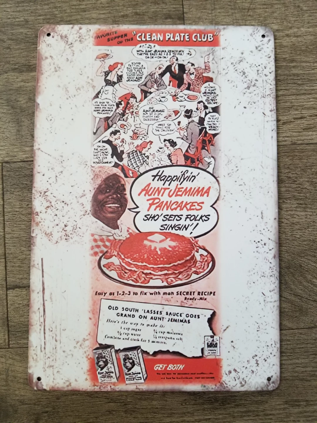 A vintage-style metal sign celebrating Aunt Jemima Pancakes. It features fun cartoon graphics and a recipe for 'Old South Lasses Sauce'. A charming piece for any kitchen! Brand new 8x12