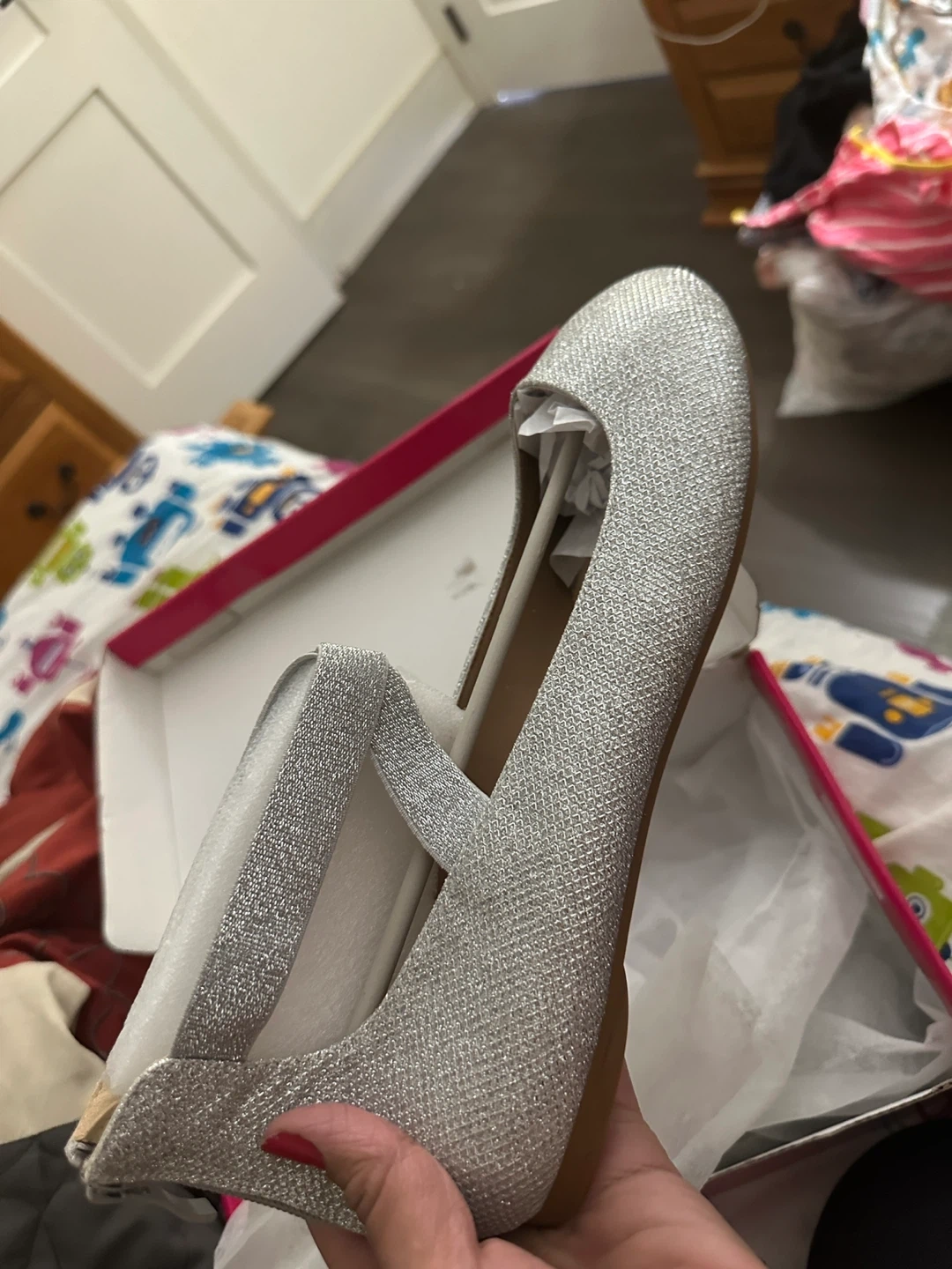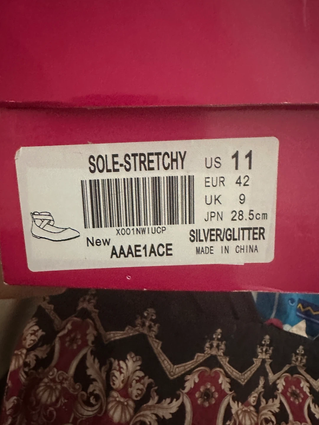 Brand new silver glitter ballet flats with an ankle strap. These are a US size 11 (EUR 42, UK 9). Made in China. Perfect for parties or special occasions!