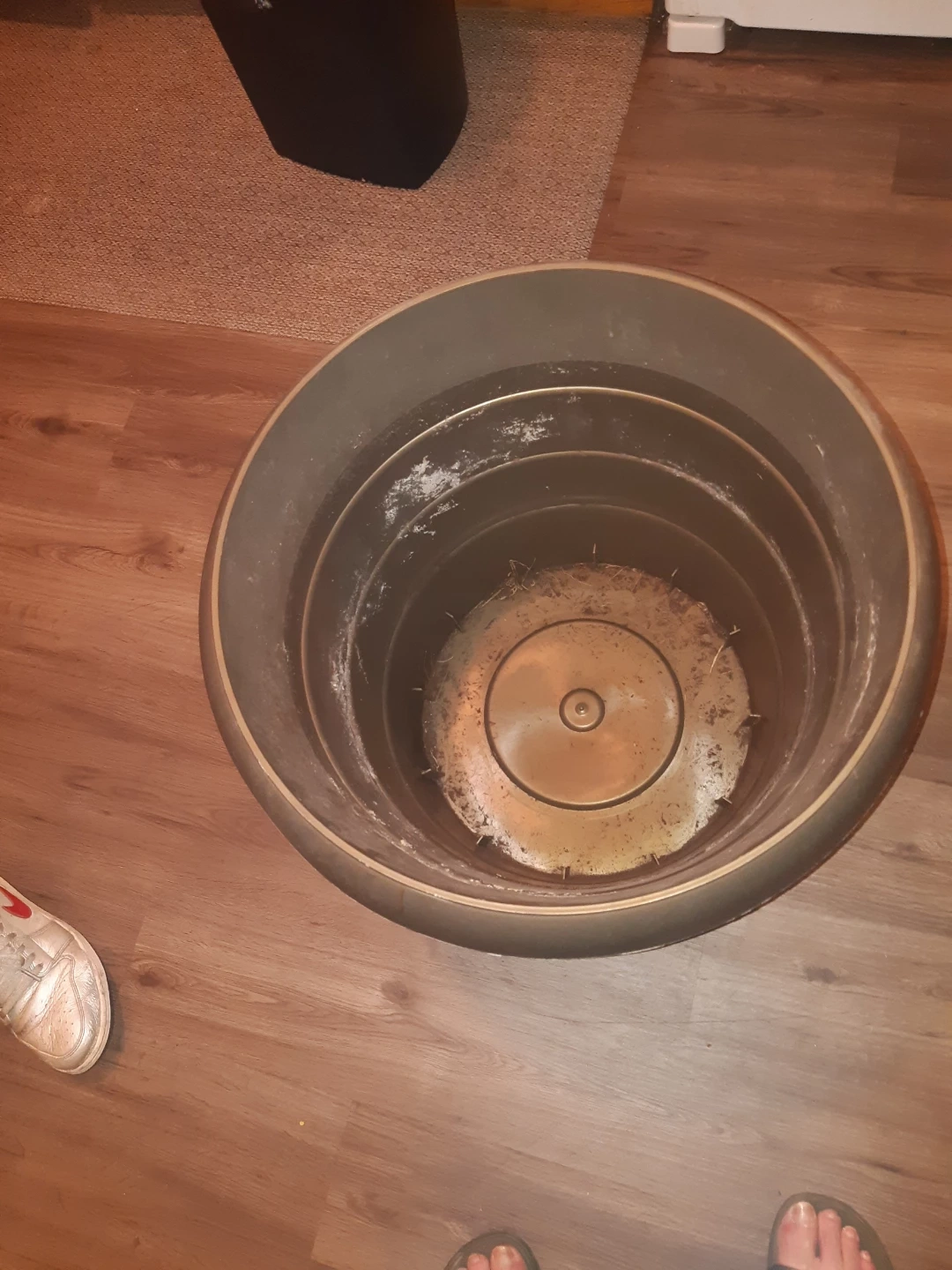 This is a large, dark brown plastic plant pot. It has a wide rim and a ribbed design. It's suitable for larger plants or for starting seedlings. Perfect for your garden or balcony!