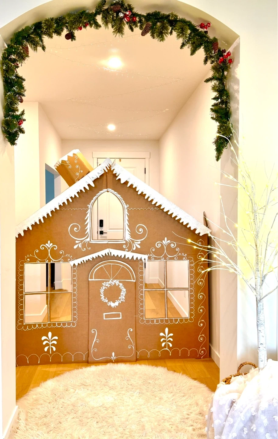 This cardboard gingerbread photo prop is perfect for Christmas picks . It's decorated with festive white details and a wreath on the door! It's a fun addition Christmas decor.