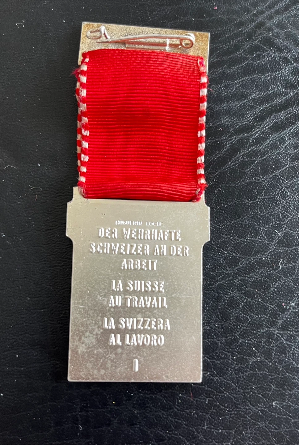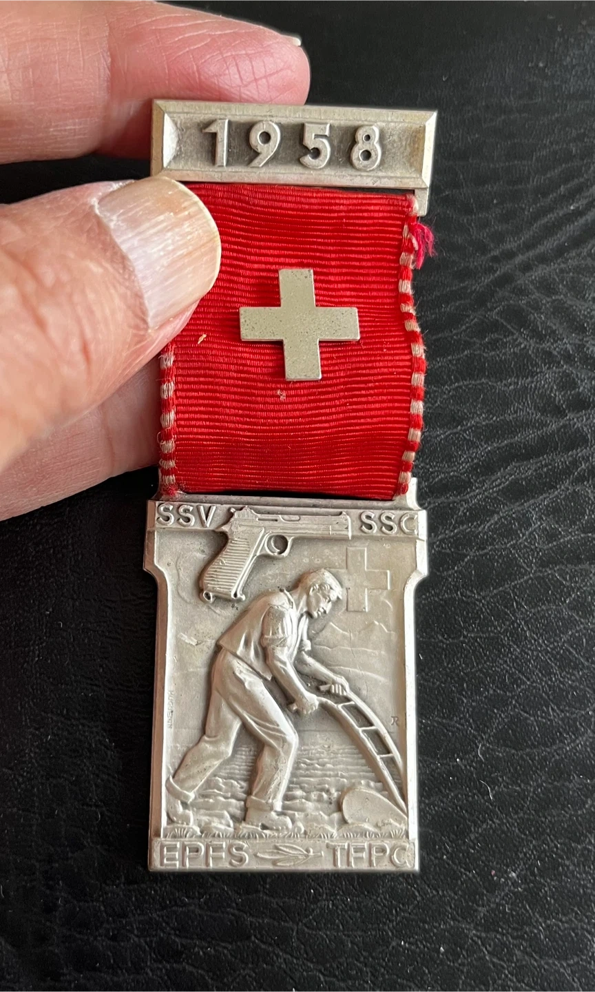 A vintage medal from the 1958 Swiss Shooting Festival. It features a red ribbon with a Swiss cross and a silver emblem depicting a man working with tools, along with a handgun. The inscription on the back is in German, French, and Italian.