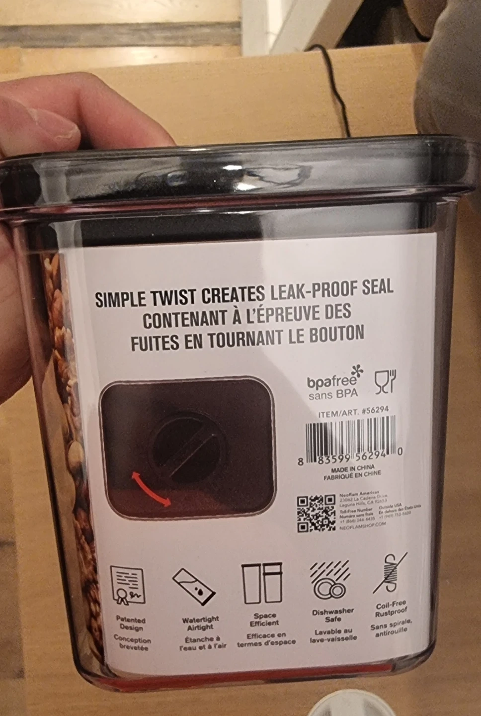 Neoflam Smart Seal rectangular storage container. It's 59 oz or 1.75 L. This container has a watertight, leak-proof seal created by a simple twist. Dishwasher safe and BPA-free.