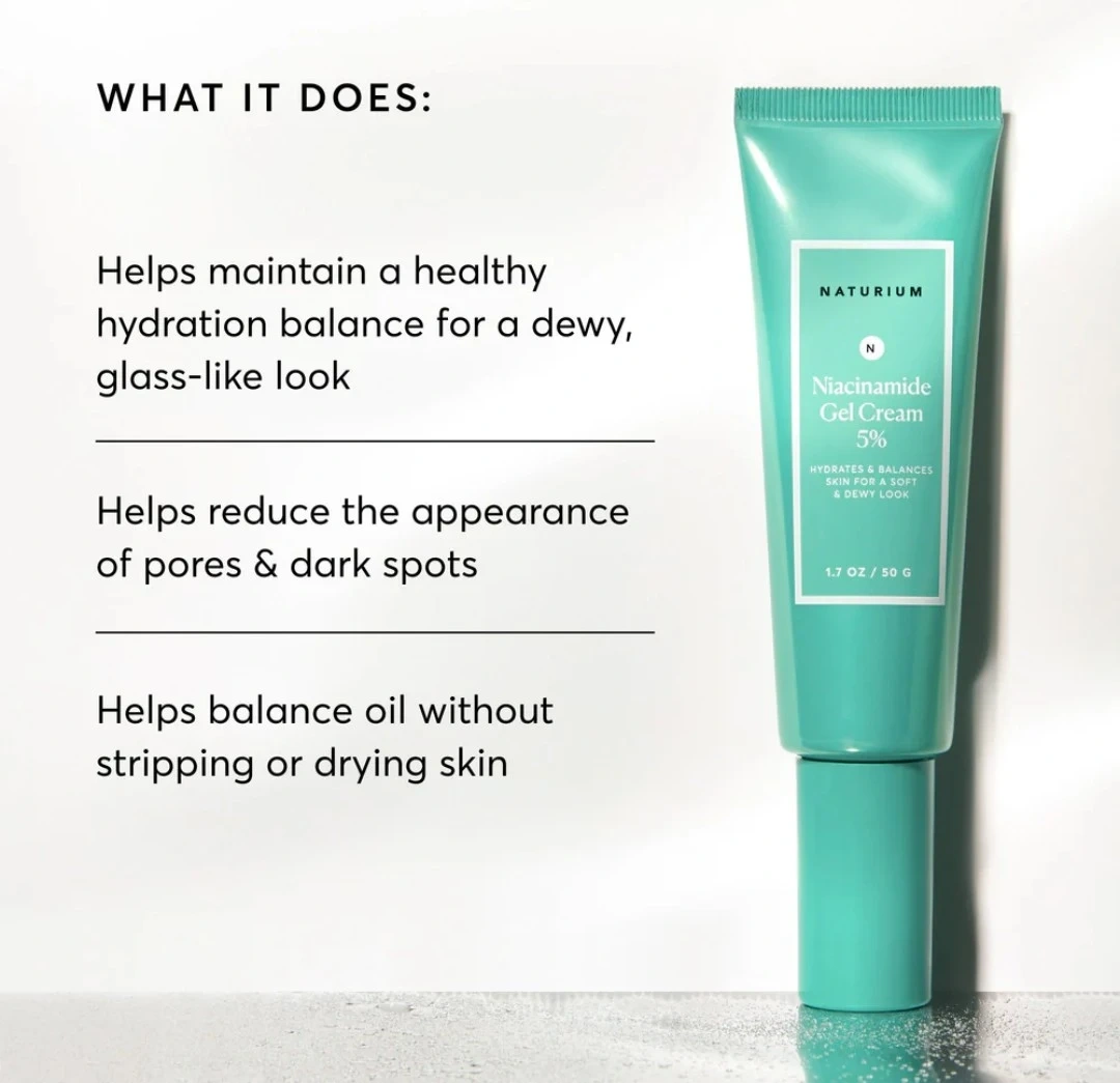 Naturium Niacinamide Gel Cream 5%. This cream helps maintain a healthy hydration balance, reduces the appearance of pores & dark spots, and balances oil without stripping or drying skin.