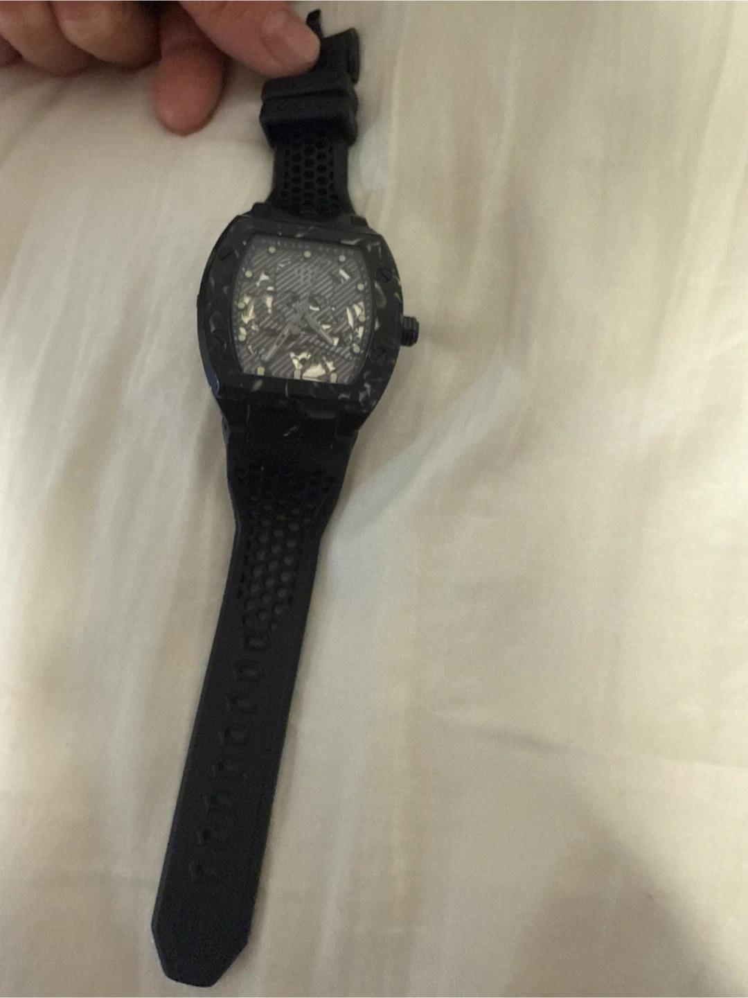 This is a black Philipp Plein watch with a distinctive "PP" logo on the back. It features a textured strap and a unique dial design. Water resistant.