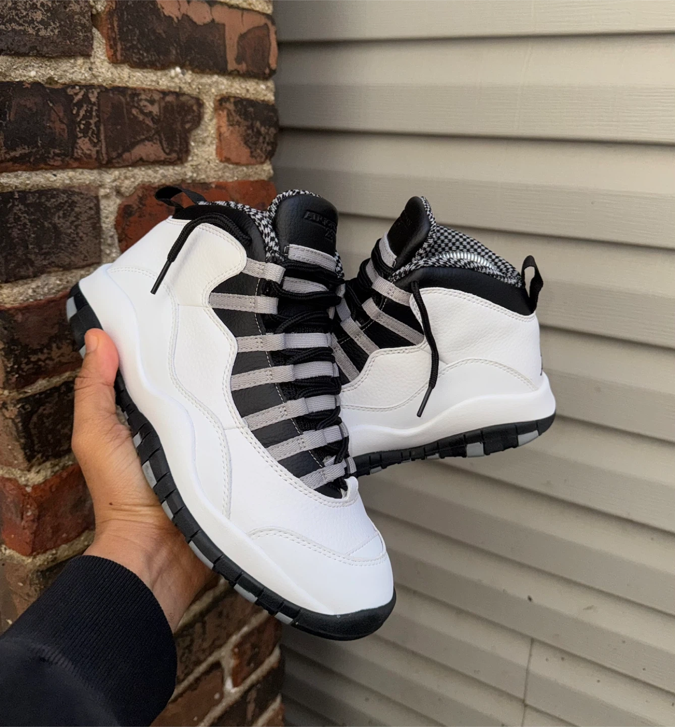 White leather Air Jordan 10 Retro sneakers in the "City Pack" colorway. Features black and grey striped accents, a checkered lining, and a durable rubber sole. These shoes are great for everyday wear and collecting!