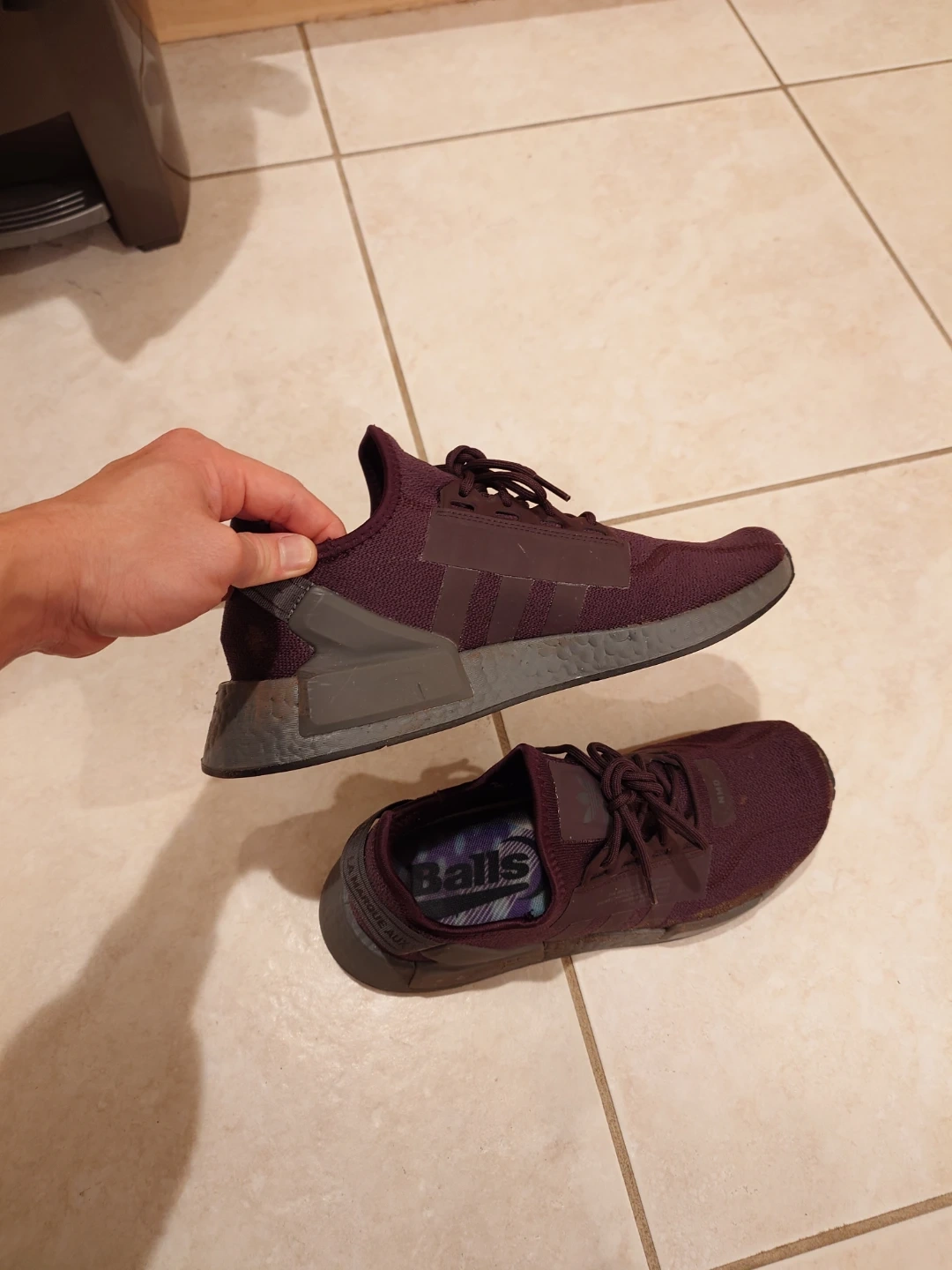 Burgundy Adidas NMD sneakers with "Balls" insoles. These shoes are made with a breathable knit upper and feature a comfortable Boost midsole. They're perfect for everyday wear or light athletic activity.