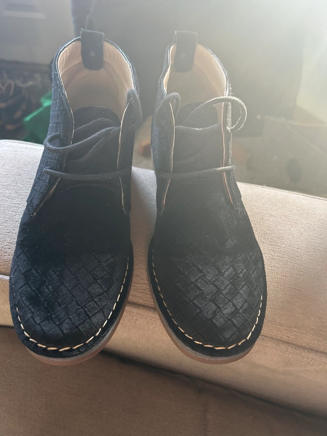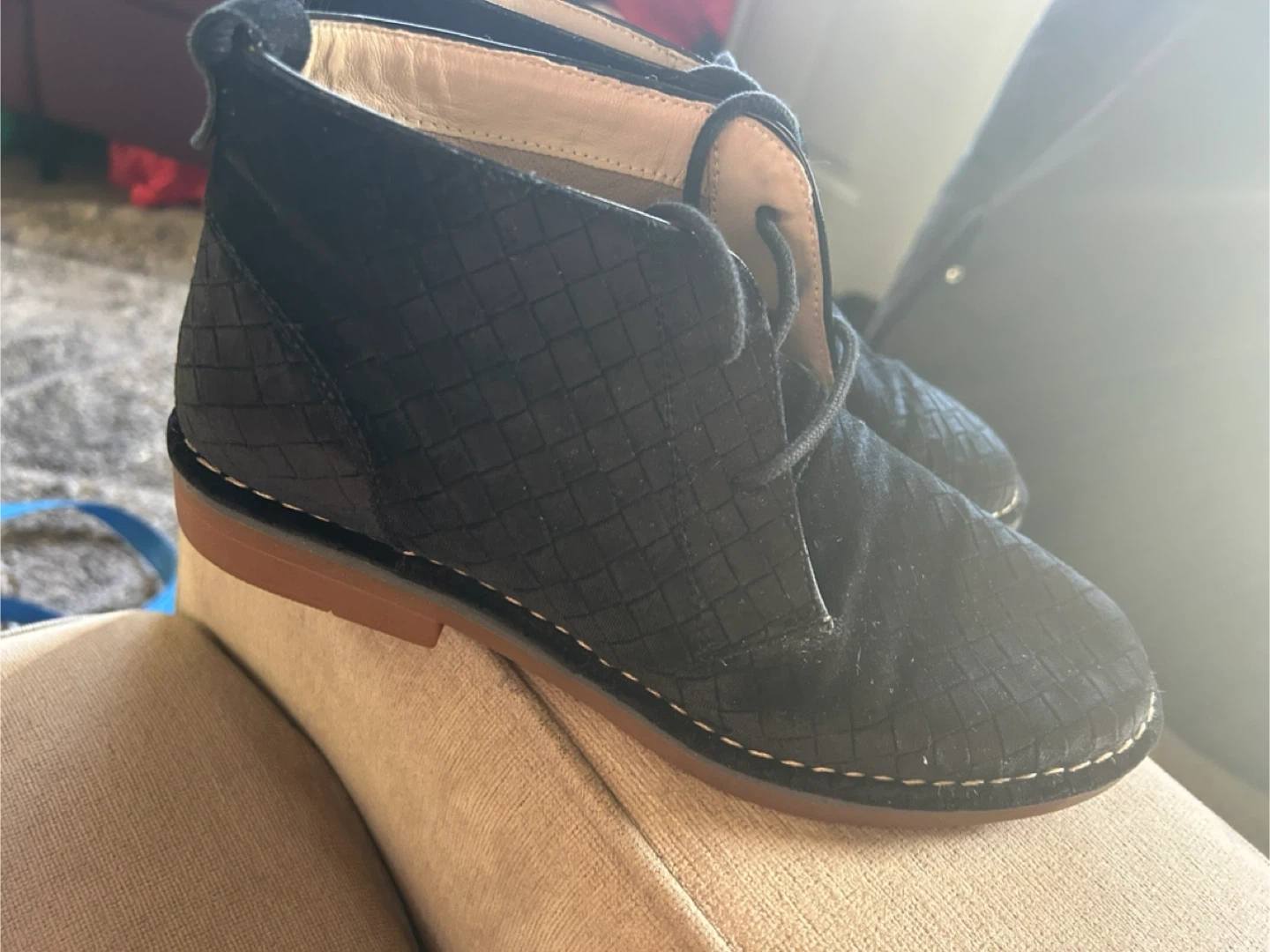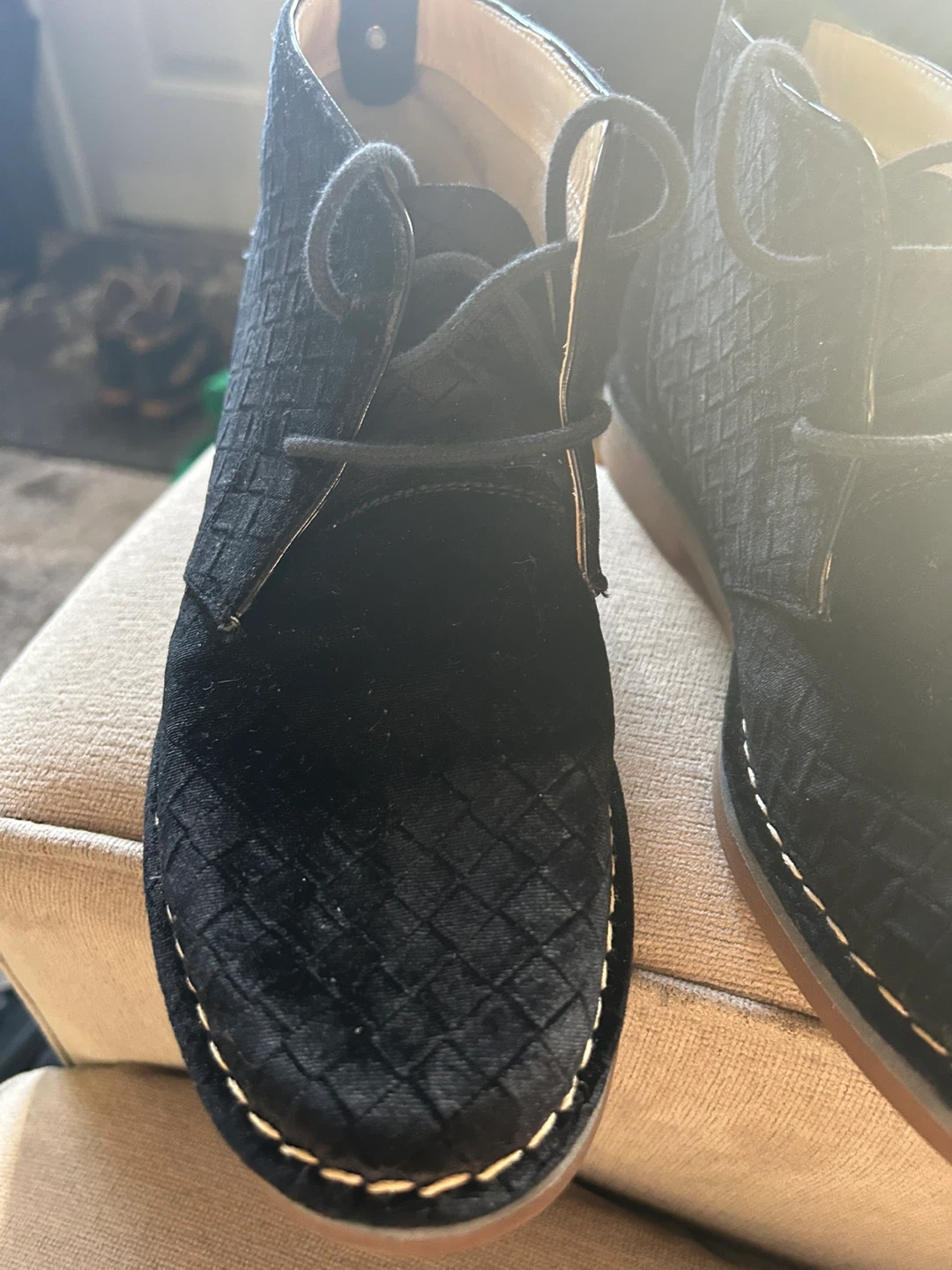 Black suede chukka boots from Hush Puppies. Features a diamond-stitched pattern on the upper and a durable rubber sole. Perfect for casual wear!