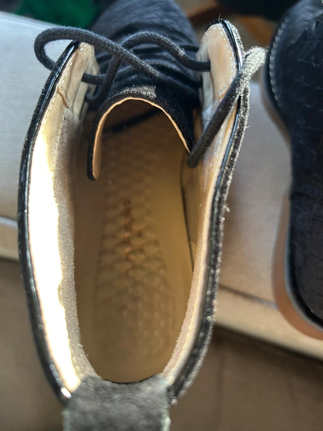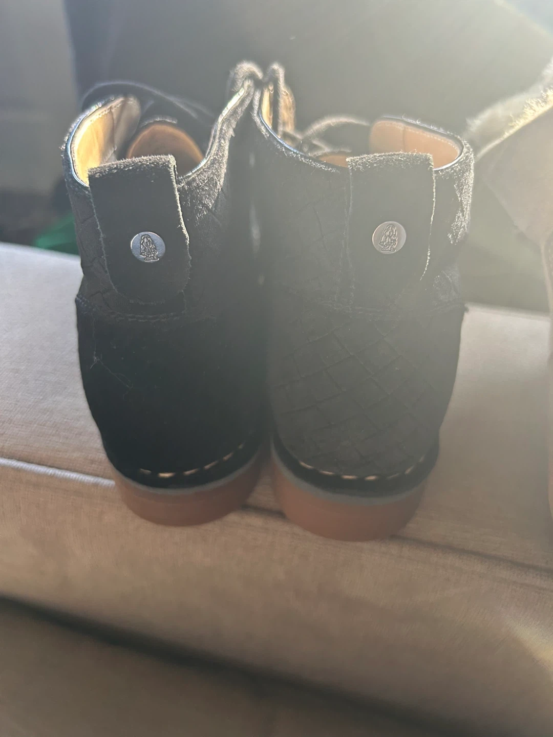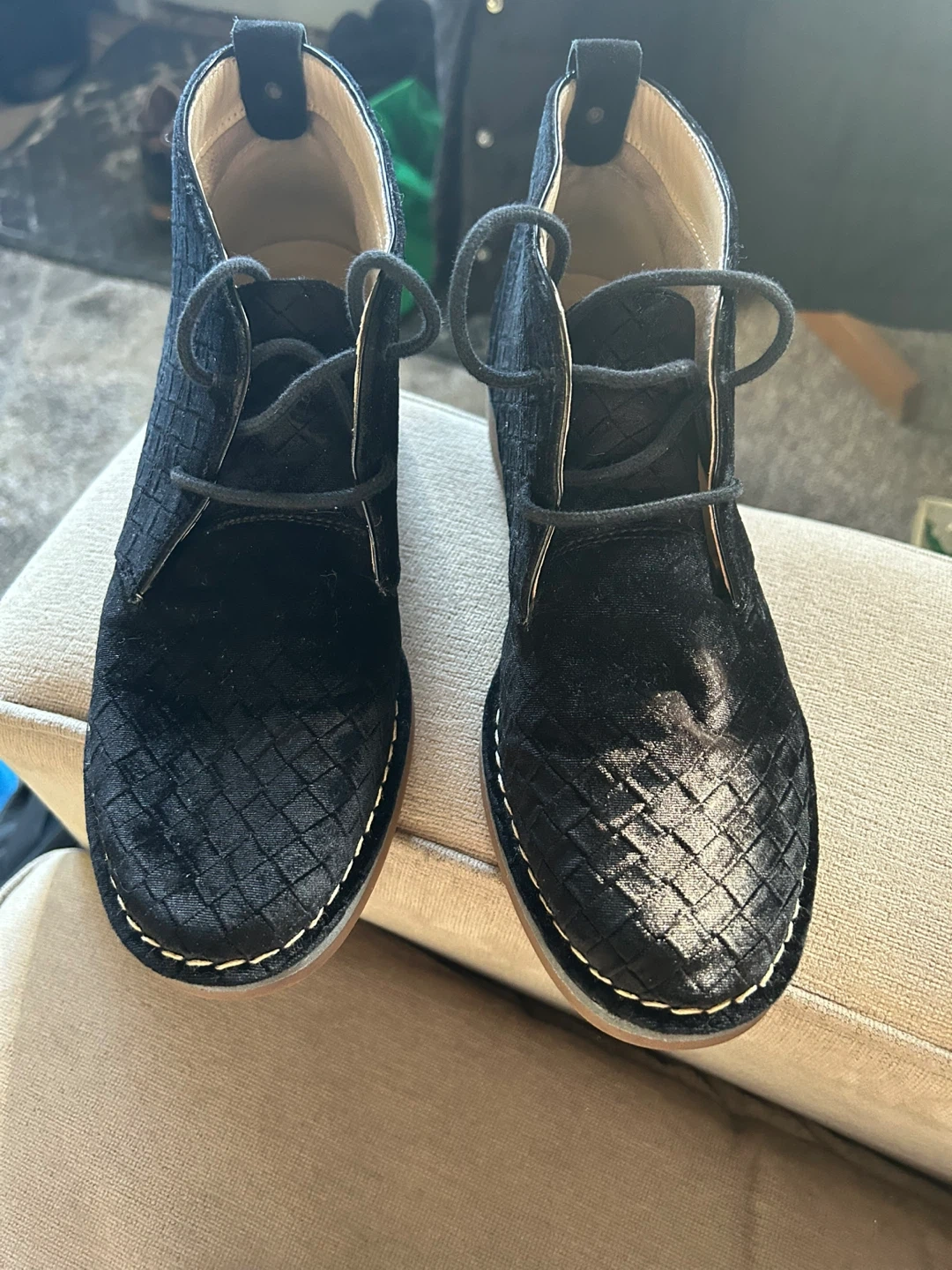 Black suede chukka boots from Hush Puppies. Features a diamond-stitched pattern on the upper and a durable rubber sole. Perfect for casual wear!