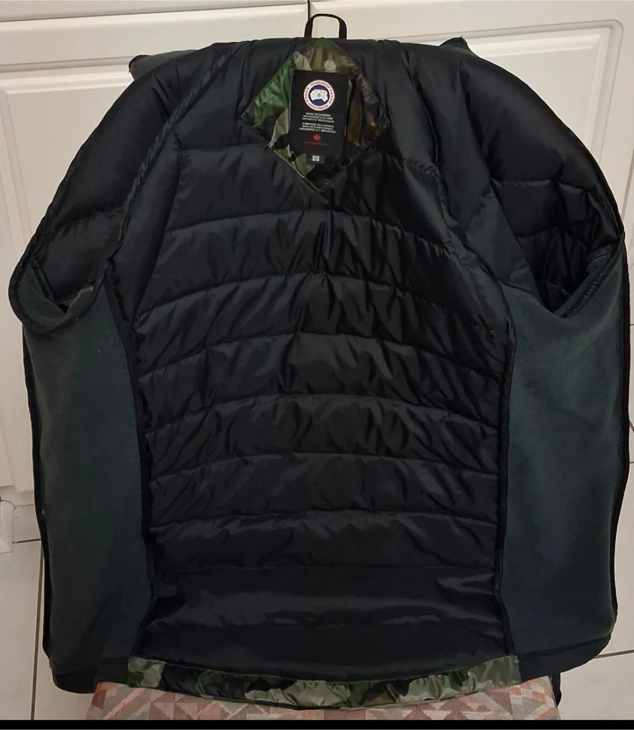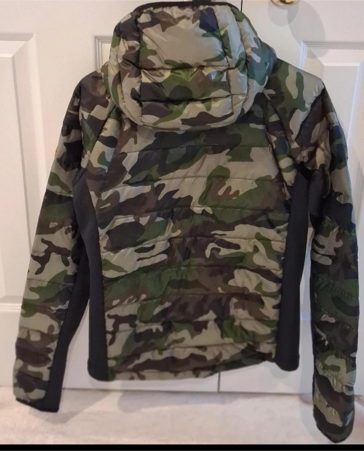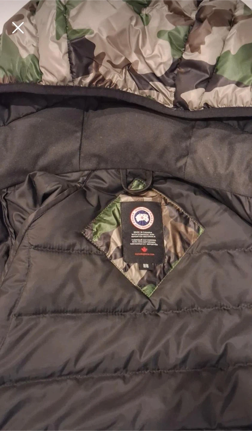 This is a Canada Goose puffer jacket in a camouflage pattern. It's a size medium. The jacket is made with durable materials and features a hood.like new conditions asking $300 f
