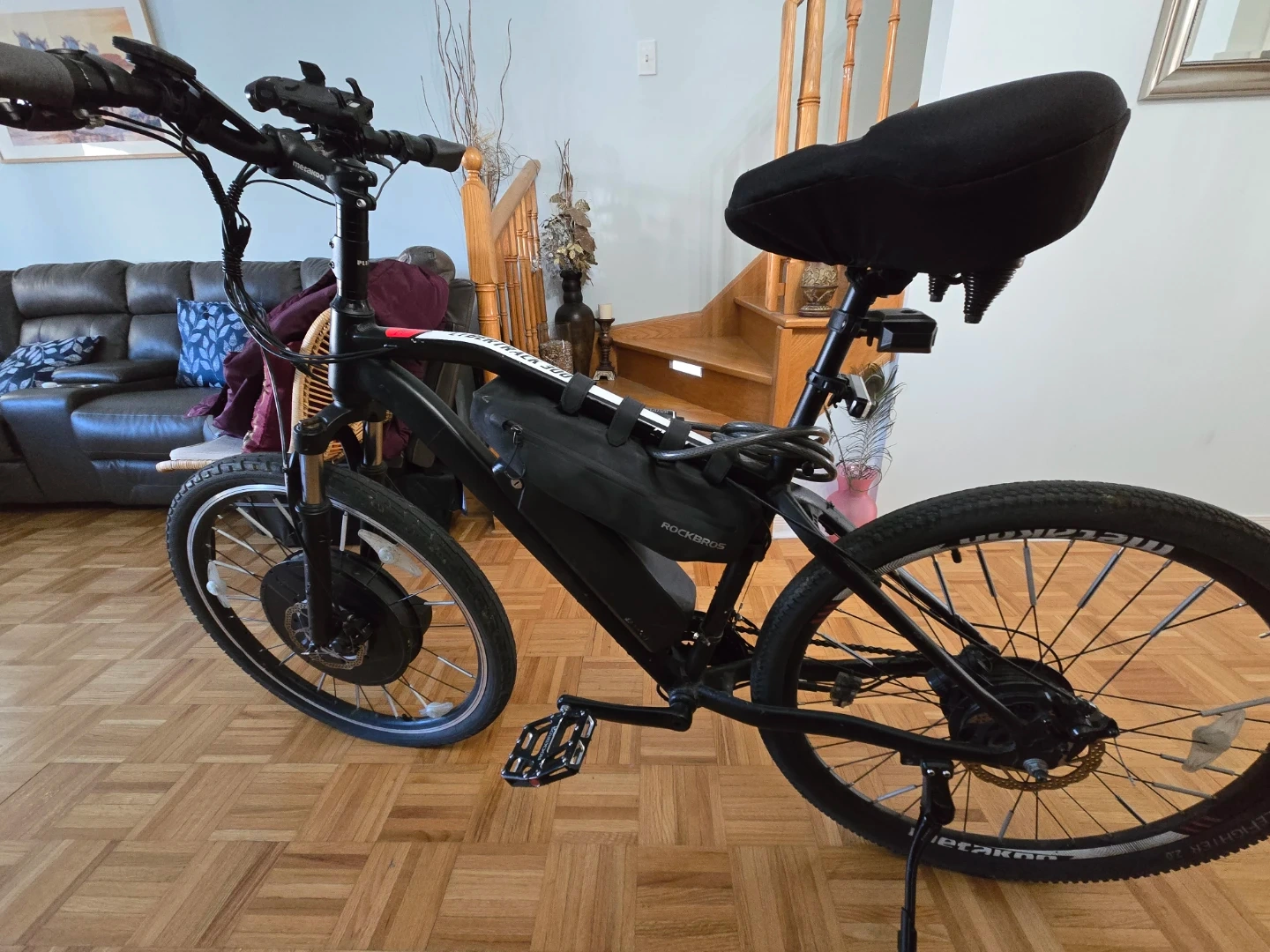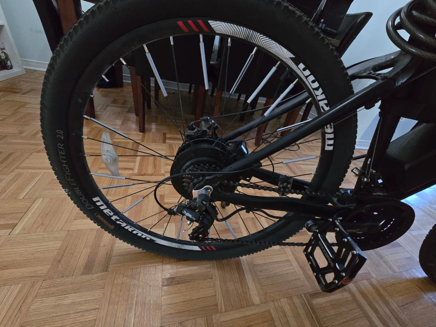 This custom dual e-bike is truly exceptional. It features custom grips and wheels, and its two motors work in tandem to deliver impressive speeds. It remains in excellent condition, riding as well as it did on the first day. Due to an upcoming move to another country, I am unfortunately unable to keep it. If this advertisement catches your eye, I encourage you to send me a direct message; it is an incredibly enjoyable ride. Fun asf!