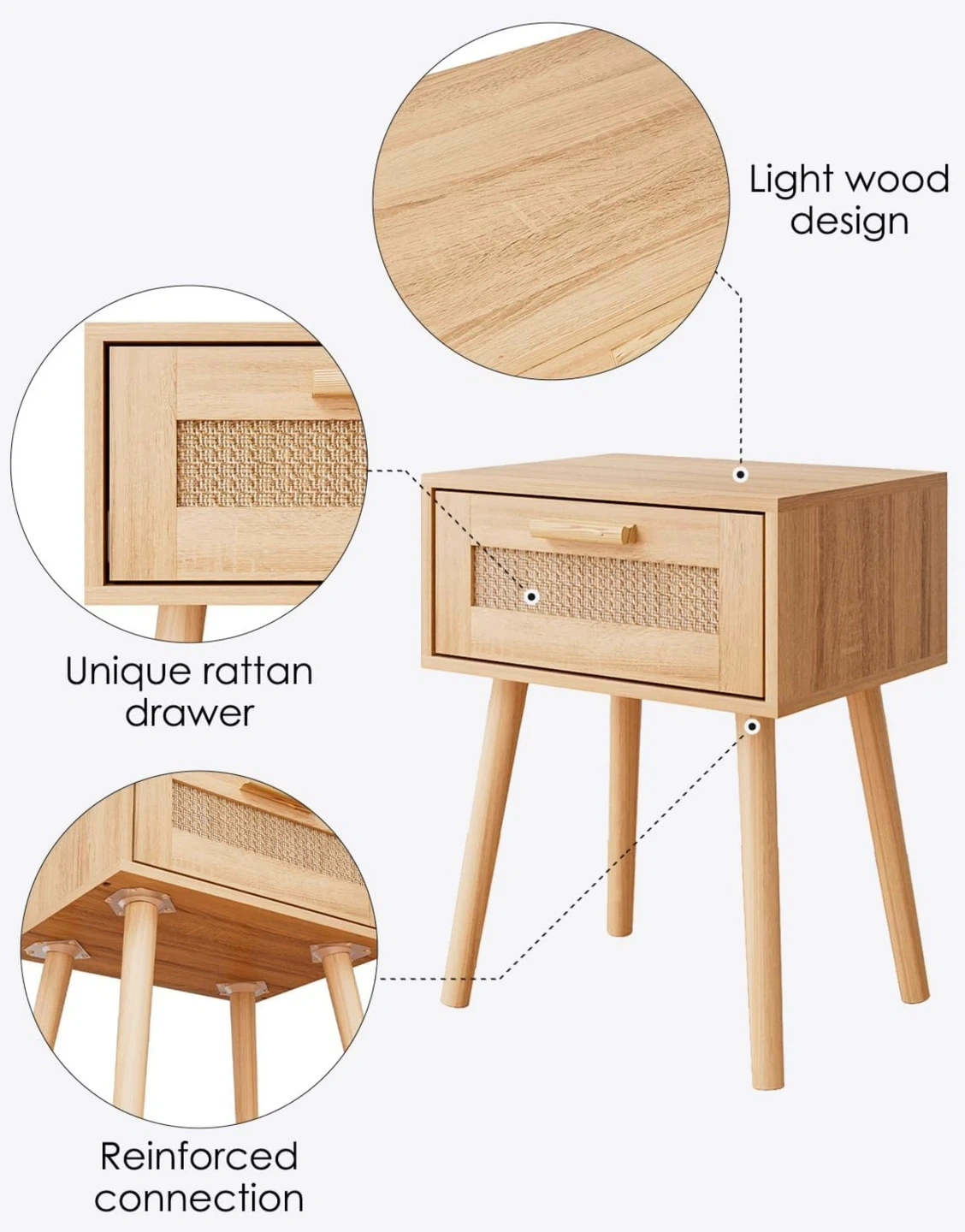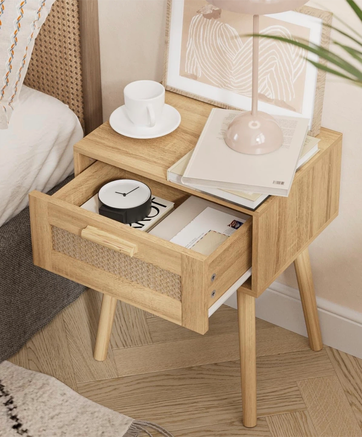 Light Wood Nightstand with Rattan Drawer