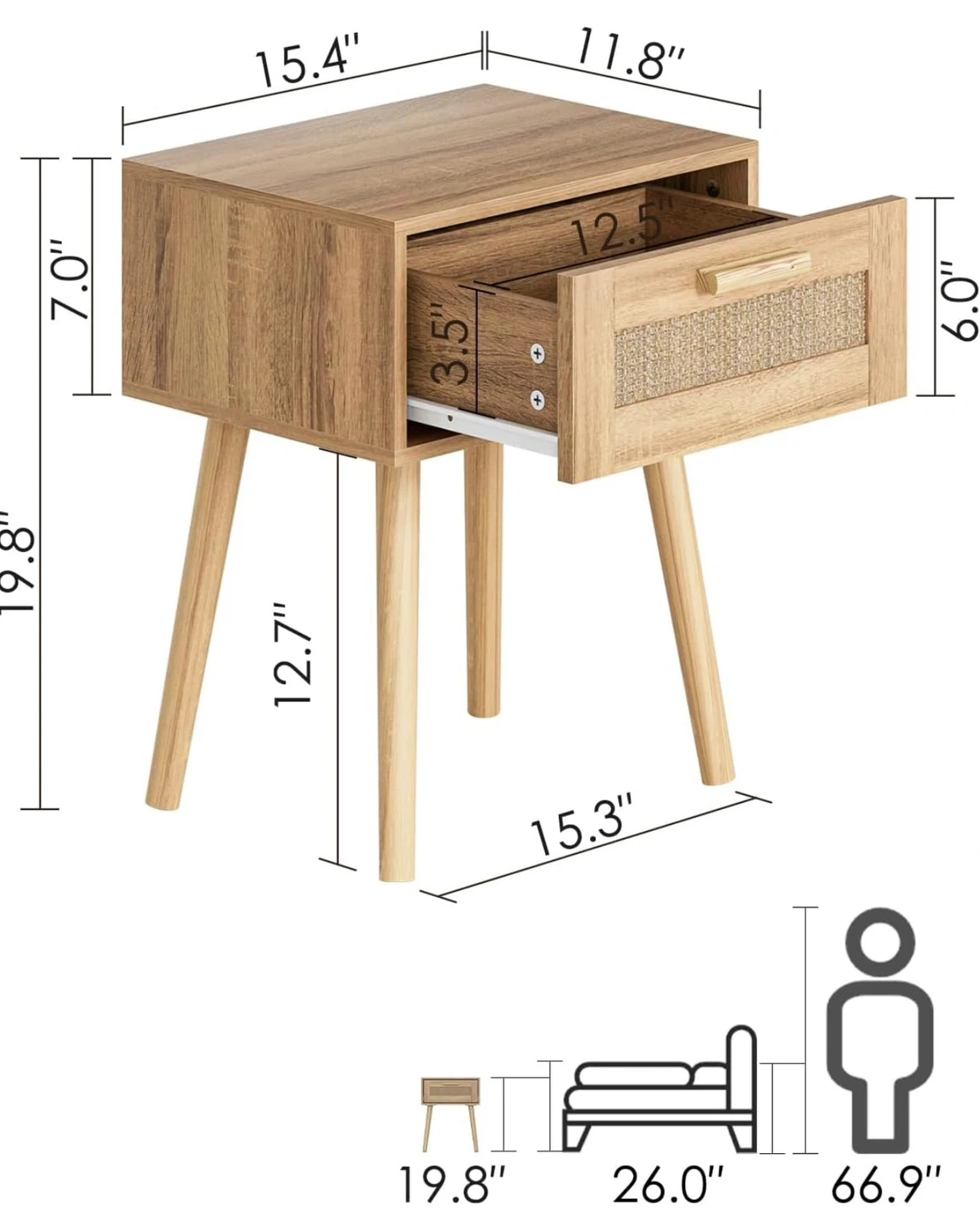 This bedside table features a light wood design with a unique rattan drawer front. It's perfect for storing essentials next to your bed. Assembly instructions and hardware are included. Dimensions: 15.4" W x 11.8" D x 19.8" H.