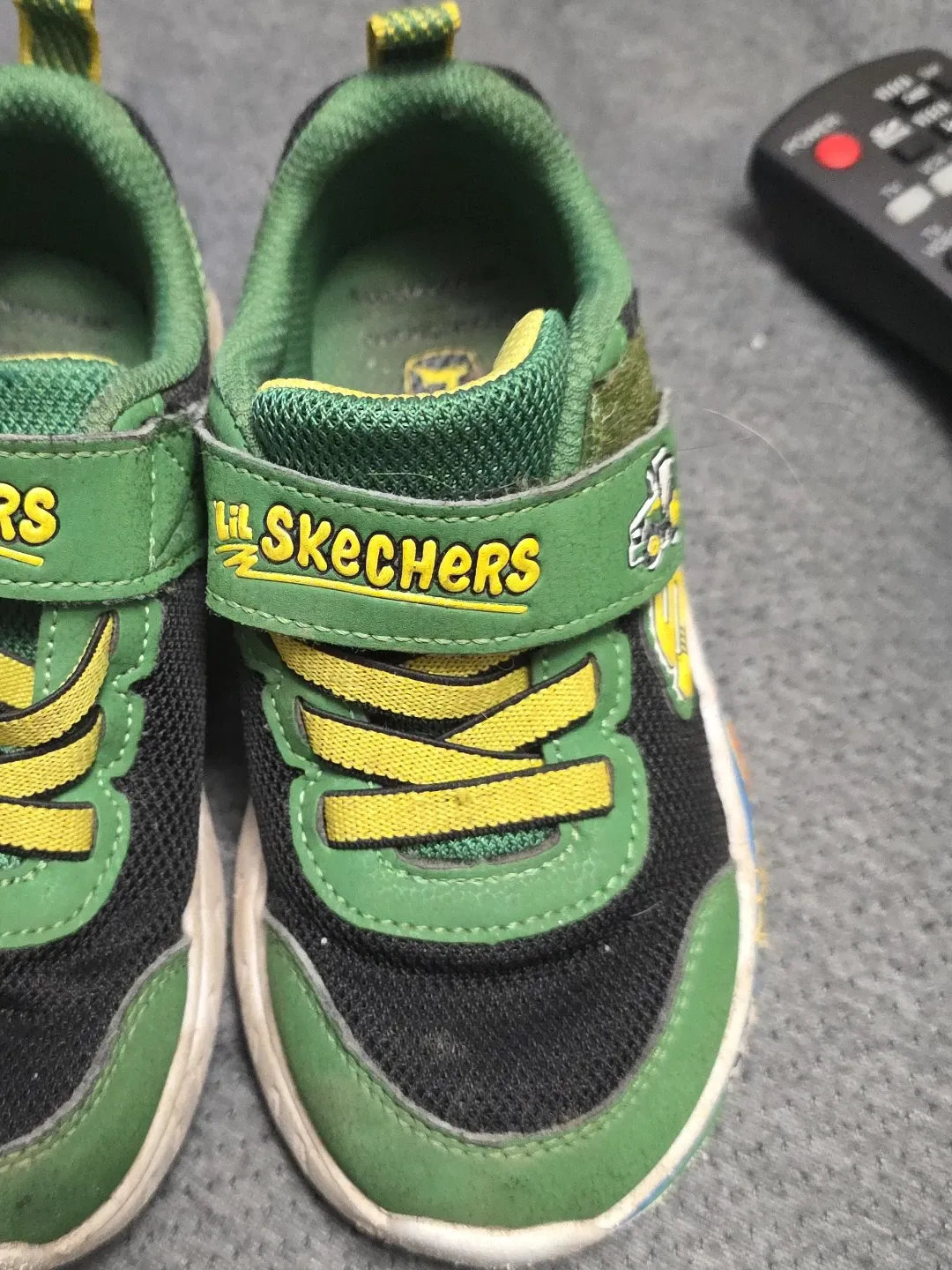 These are Lil' Skechers toddler shoes in a green and black colourway. They feature velcro straps and yellow laces. Perfect for little ones on the go!