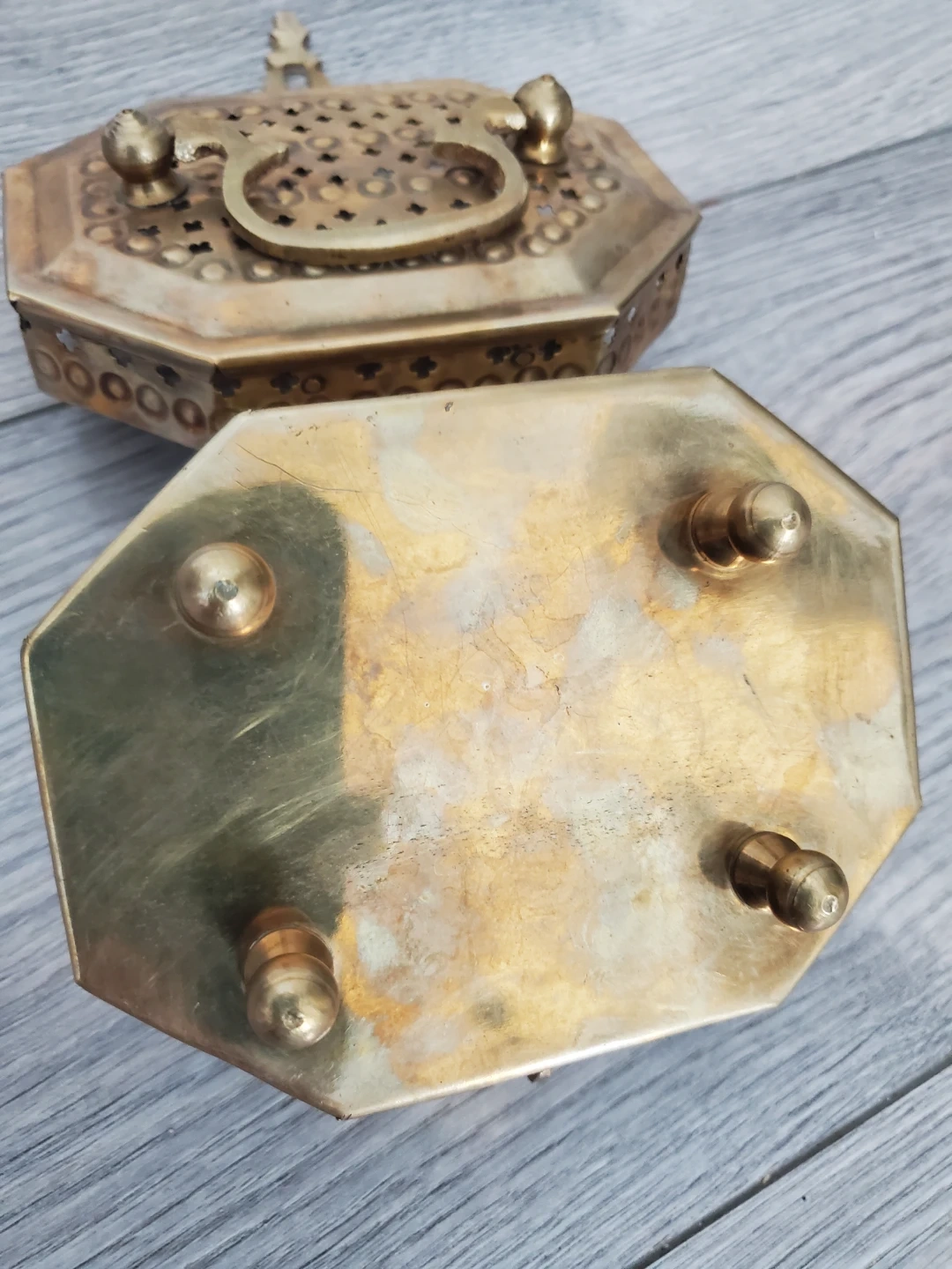 Selling a unique vintage brass decorative box. It has an octagonal shape with intricate cut-out designs on the sides and lid. The box shows some signs of wear, which adds to its vintage charm. Perfect for storing small trinkets or as a decorative piece!