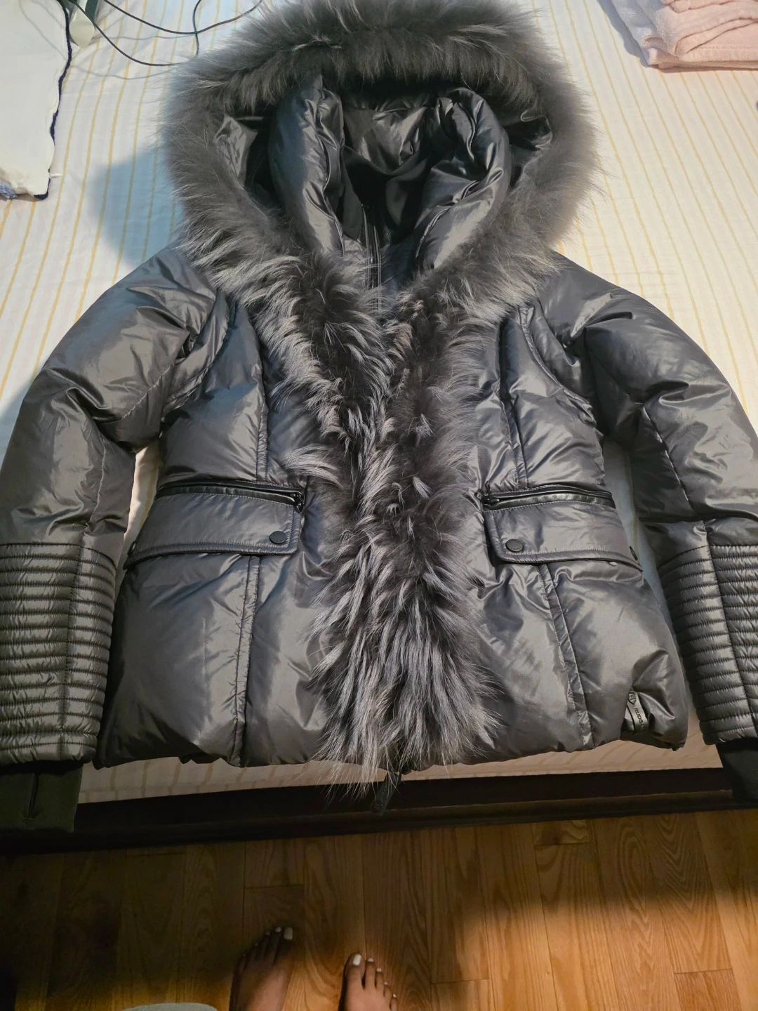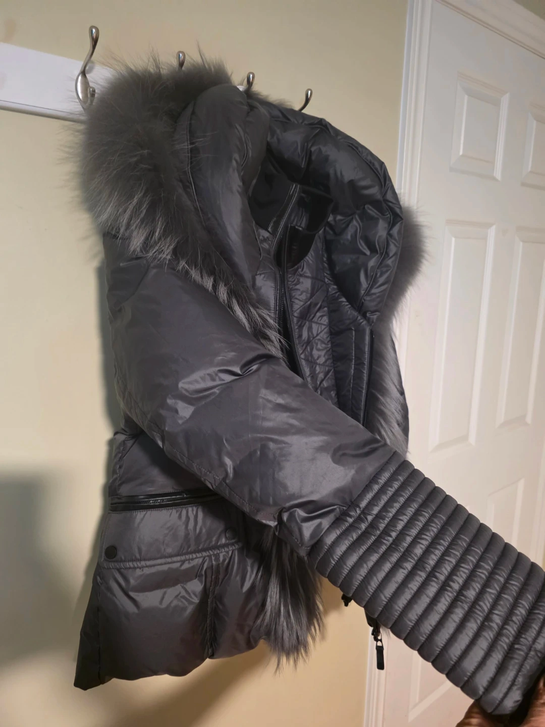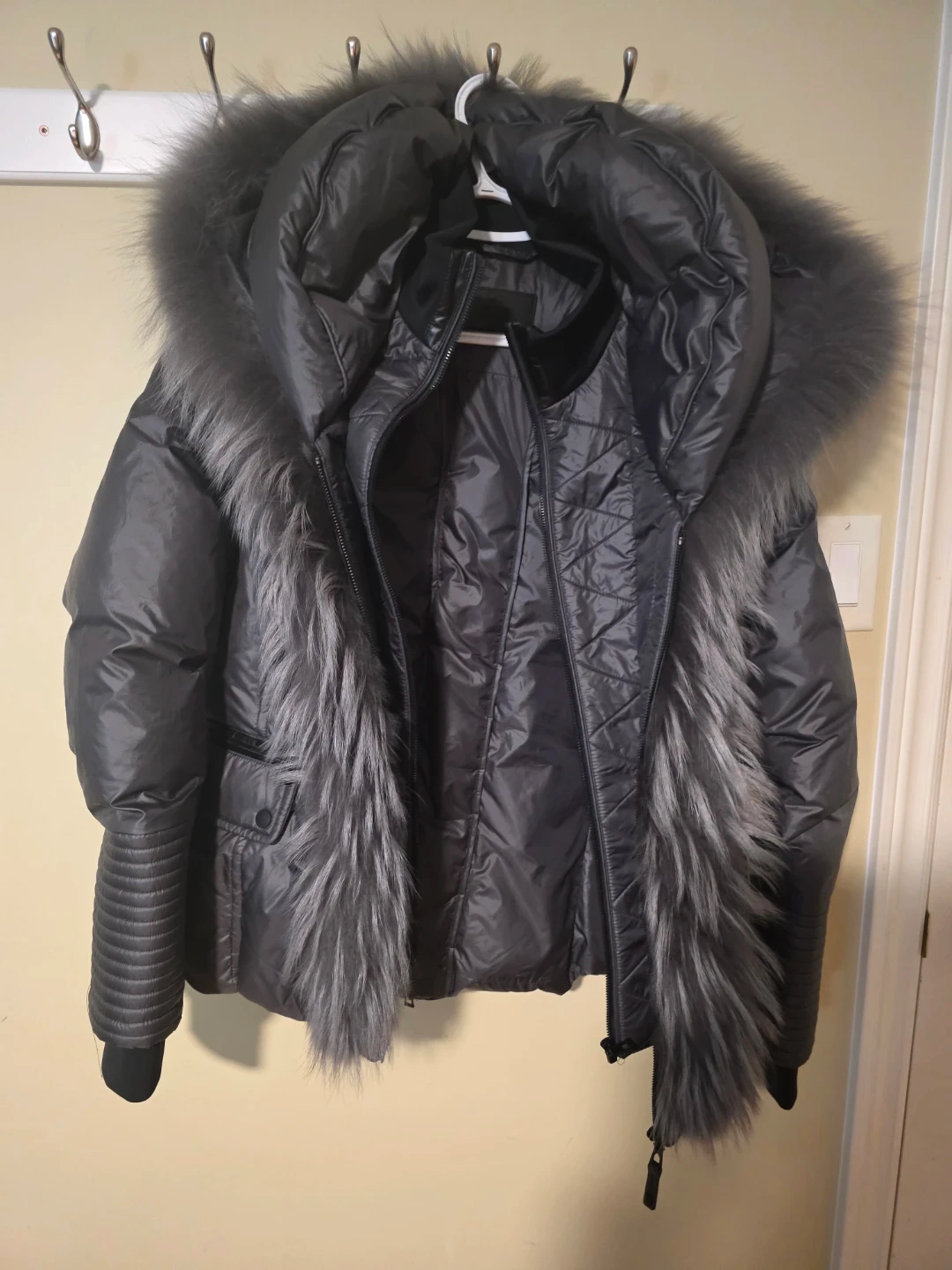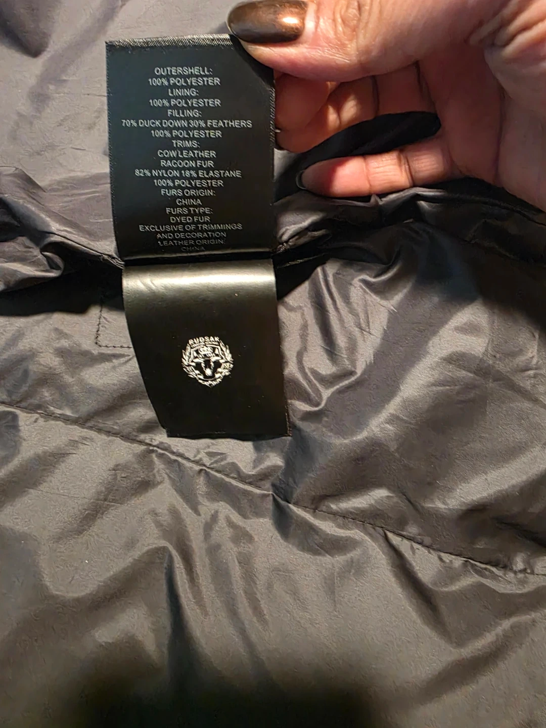 This Rudsak puffer jacket is filled with 70% duck down and 30% feathers. The outershell is 100% polyester with trims of cow leather, raccoon fur, and rabbit fur. It's grey with ribbed cuffs and a fur-lined hood for extra warmth. It is brand new. Received as a Xmas gift 2025. Too big for me.