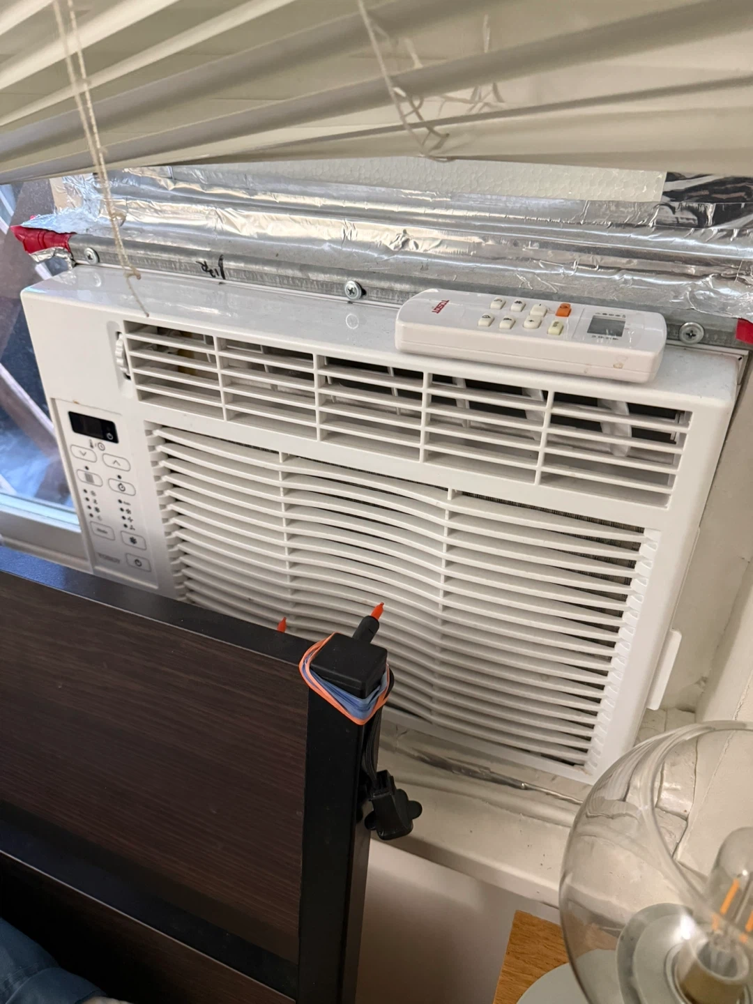 White window air conditioner unit. It comes with a remote control. This unit is great for keeping a room cool during warmer months!