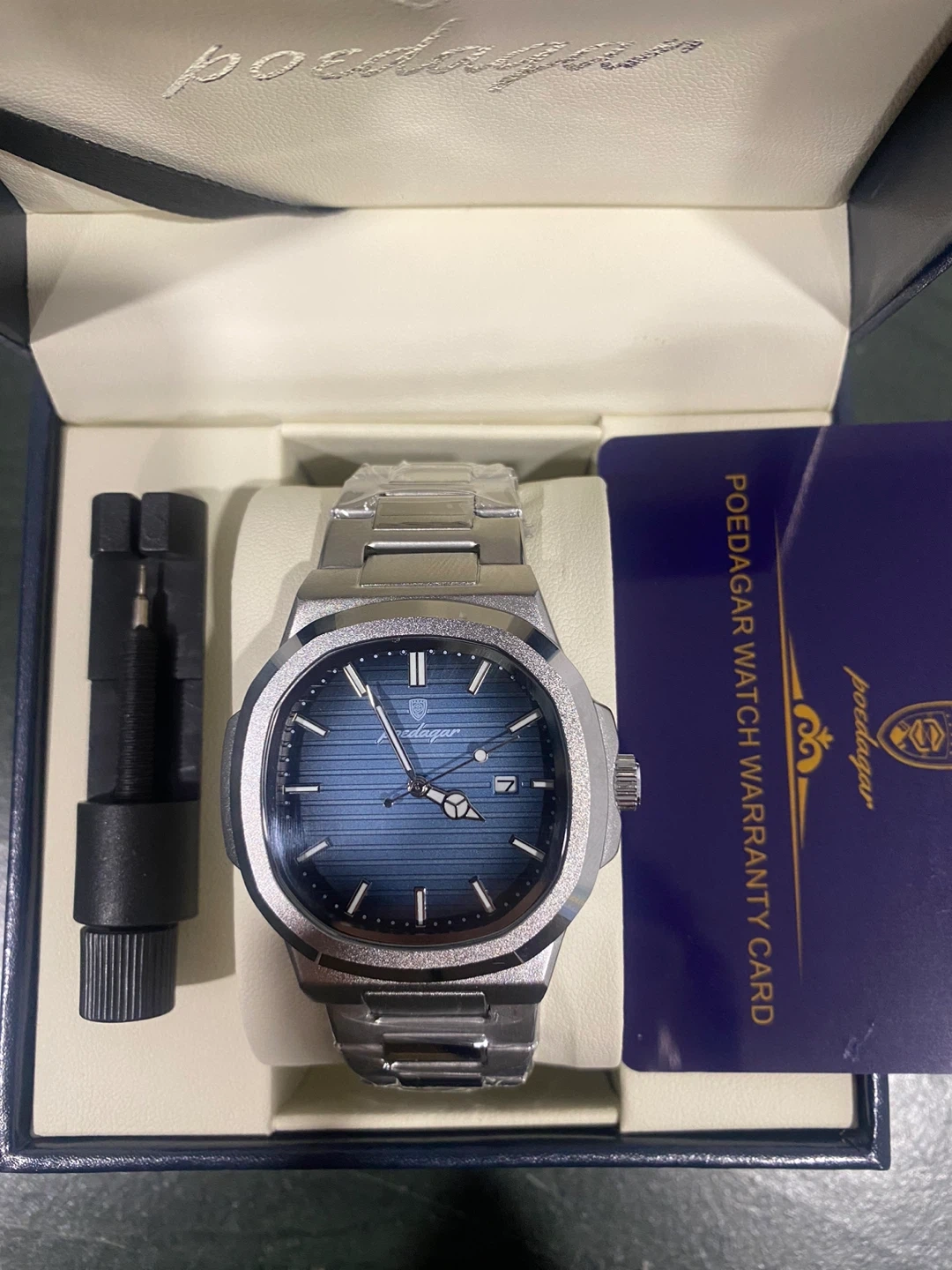 This Poedagar watch features a stylish blue dial and a durable stainless steel band. It comes with a tool for adjusting the bracelet length. The watch is presented in its original box with a warranty card included.