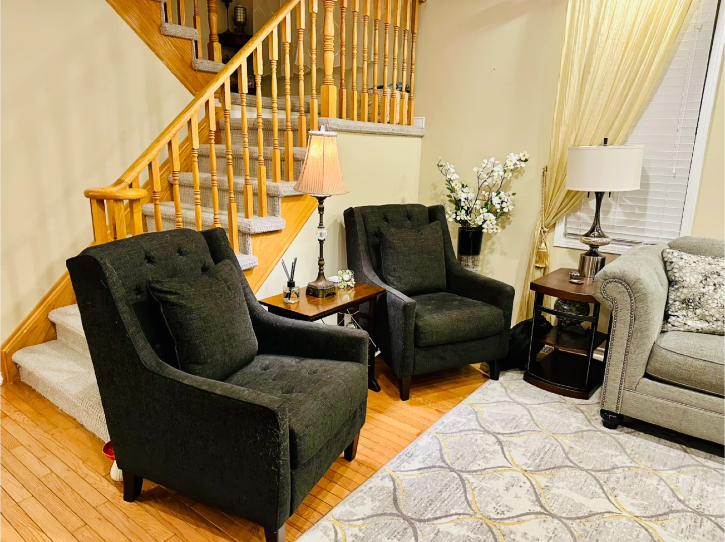 This grey tufted loveseat, sofa and 2 chairs offers comfortable seating and comes with decorative accent pillows. It's upholstered in a durable fabric. The tufted back and nailhead trim add a touch of classic style to any living room. It's perfect for smaller spaces or as an addition to a larger seating arrangement. Price is negotiable.