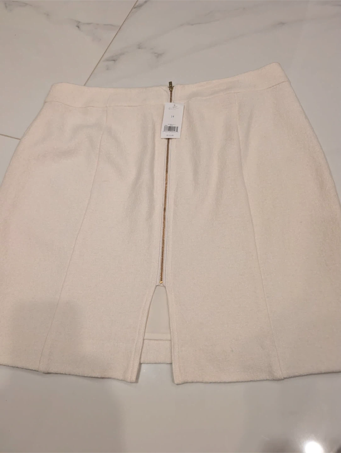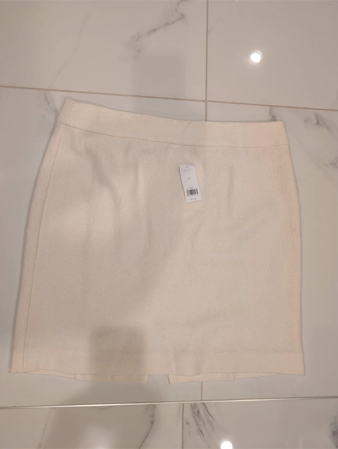 Brand new Banana Republic mini skirt with tags still attached. It's a classic cream colour with a wool blend fabric. Features a gold zipper closure at the back and a tailored fit. Size 14.