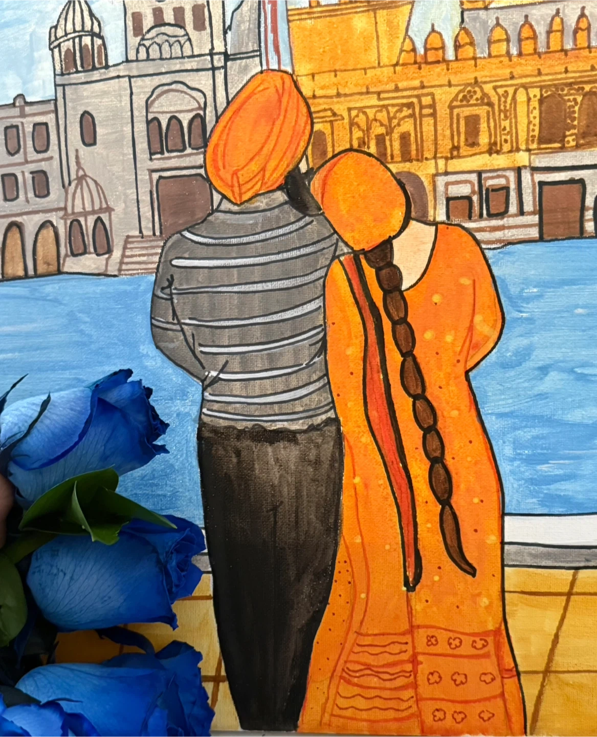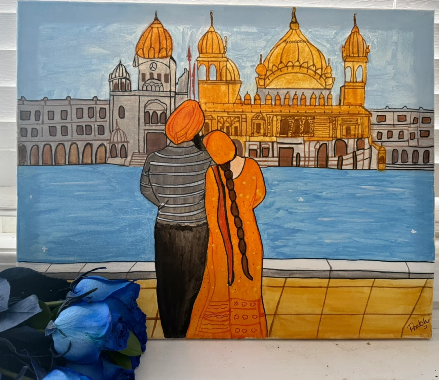 Bring love, peace, and spiritual beauty into your home with this handmade painting inspired by the Golden Temple. The artwork shows a couple standing together, admiring the holy view—symbolizing blessings, togetherness, and everlasting bond.