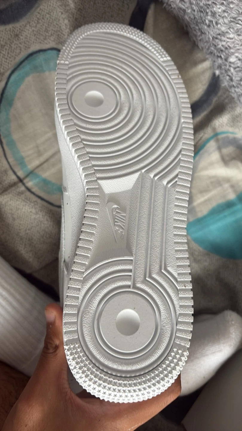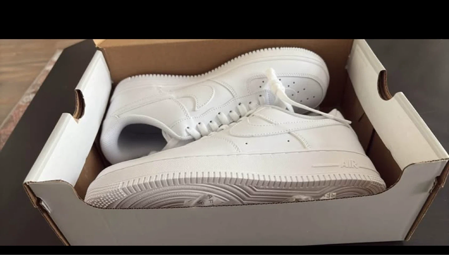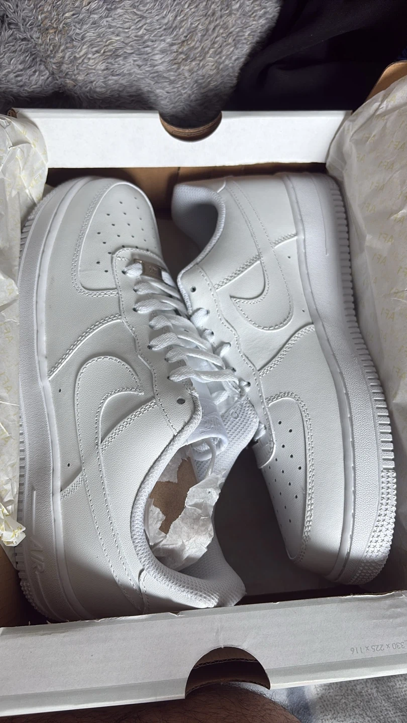 Classic white Nike Air Force 1 '07 sneakers. Includes original box. Leather upper for durability.