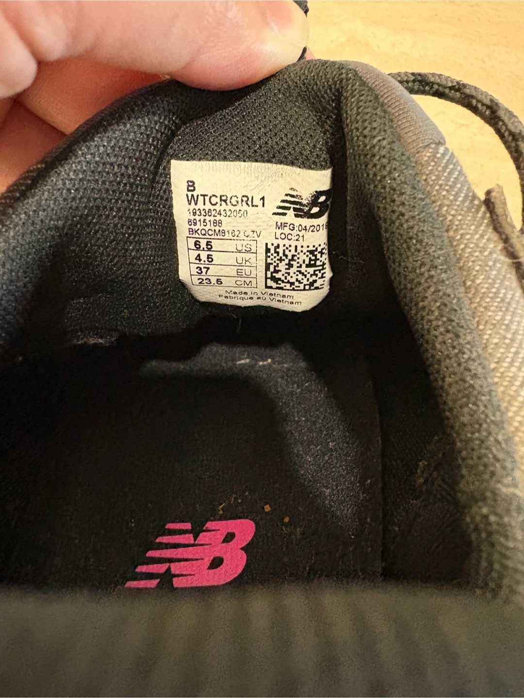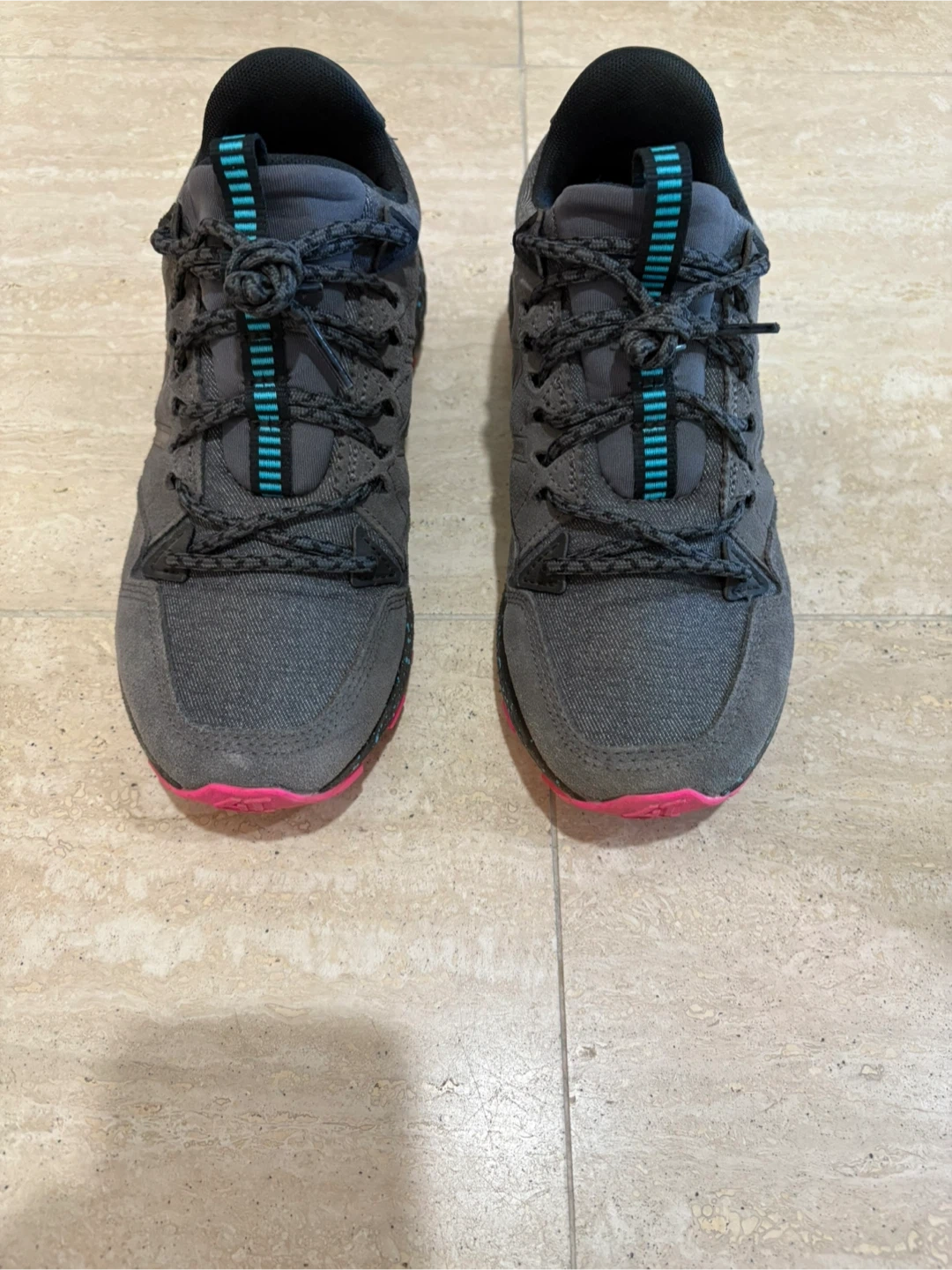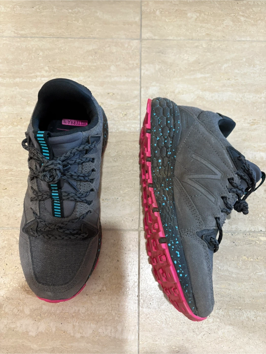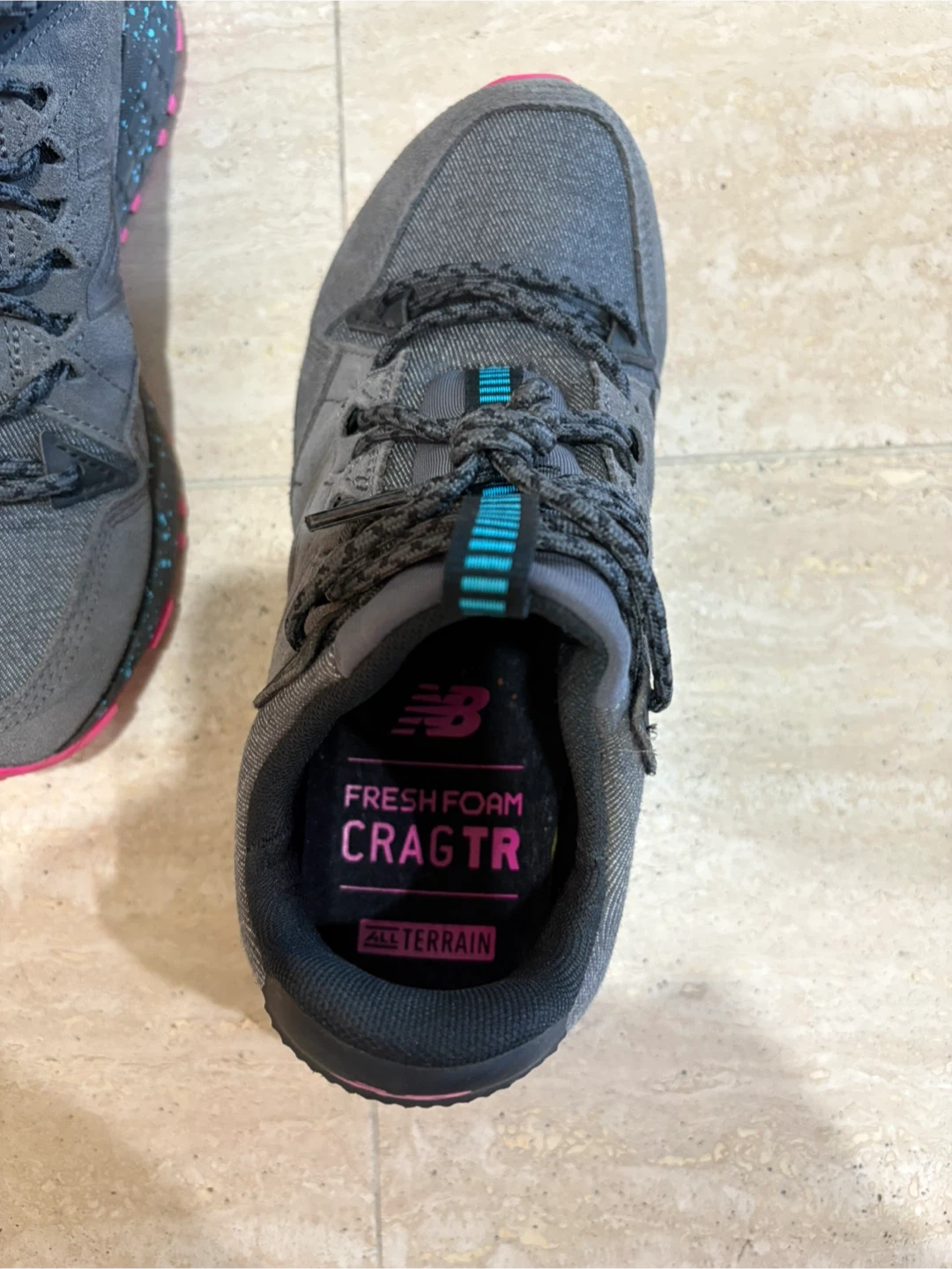 Selling a pair of New Balance Fresh Foam Crag TR trail running shoes for women. They're a size 6.5 in US sizing. The colour is a nice neutral grey with pops of pink and turquoise! These are great for all terrain.