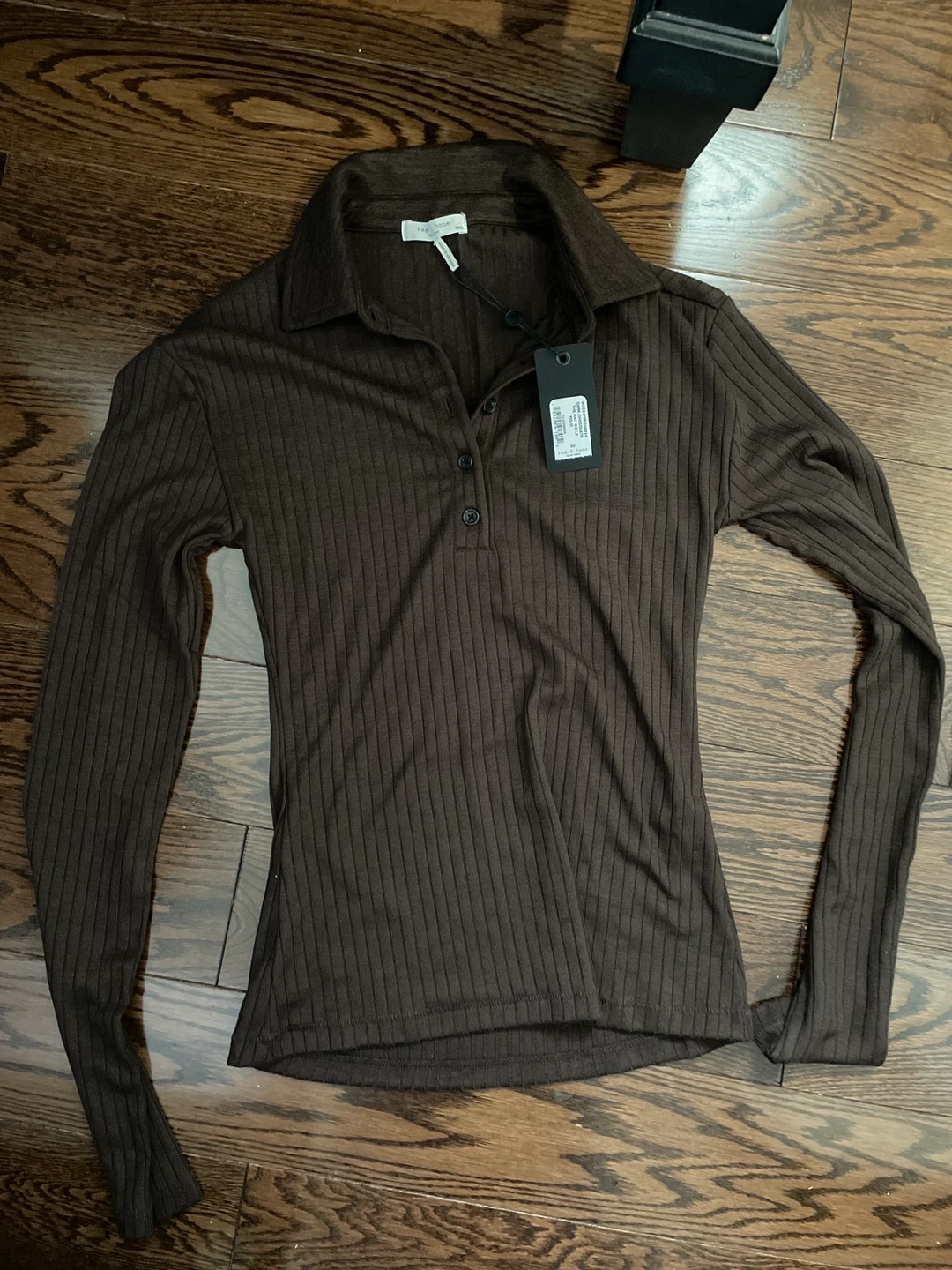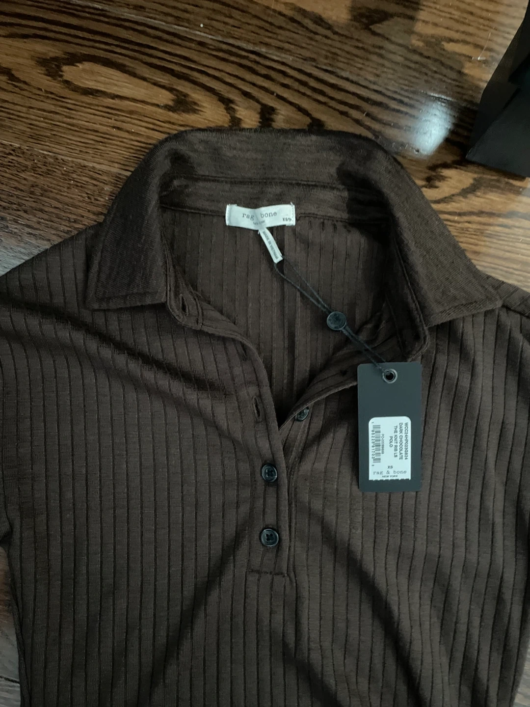 Rag & Bone long sleeve polo shirt in a dark chocolate brown colour. It's a ribbed knit fabric with a button-up neckline. Size is XS.