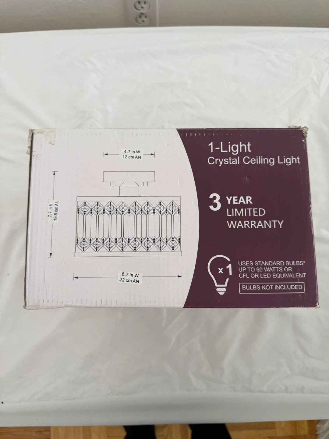 Selling a brand new 1-Light Crystal Ceiling Light! The box includes a 3 year limited warranty. It uses standard bulbs up to 60 watts or CFL or LED equivalent, but bulbs are not included. The dimensions are 4.7 in W (12 cm AN) x 7.7 in H (19.5 mm AN) x 8.7 in W (22 cm AN).