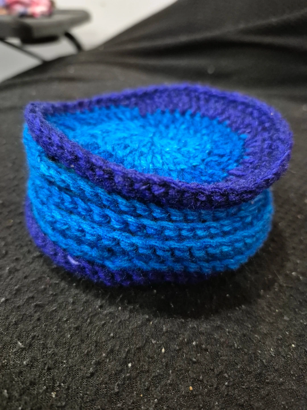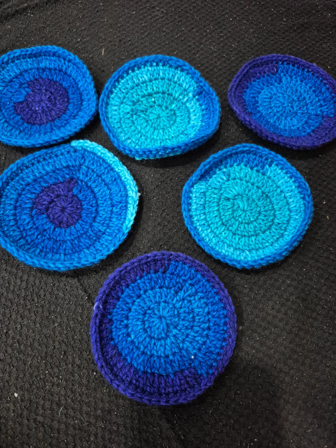 Set of six handmade crochet coasters in blue and purple hues. These are perfect for protecting surfaces from drinks. They're great for everyday use!