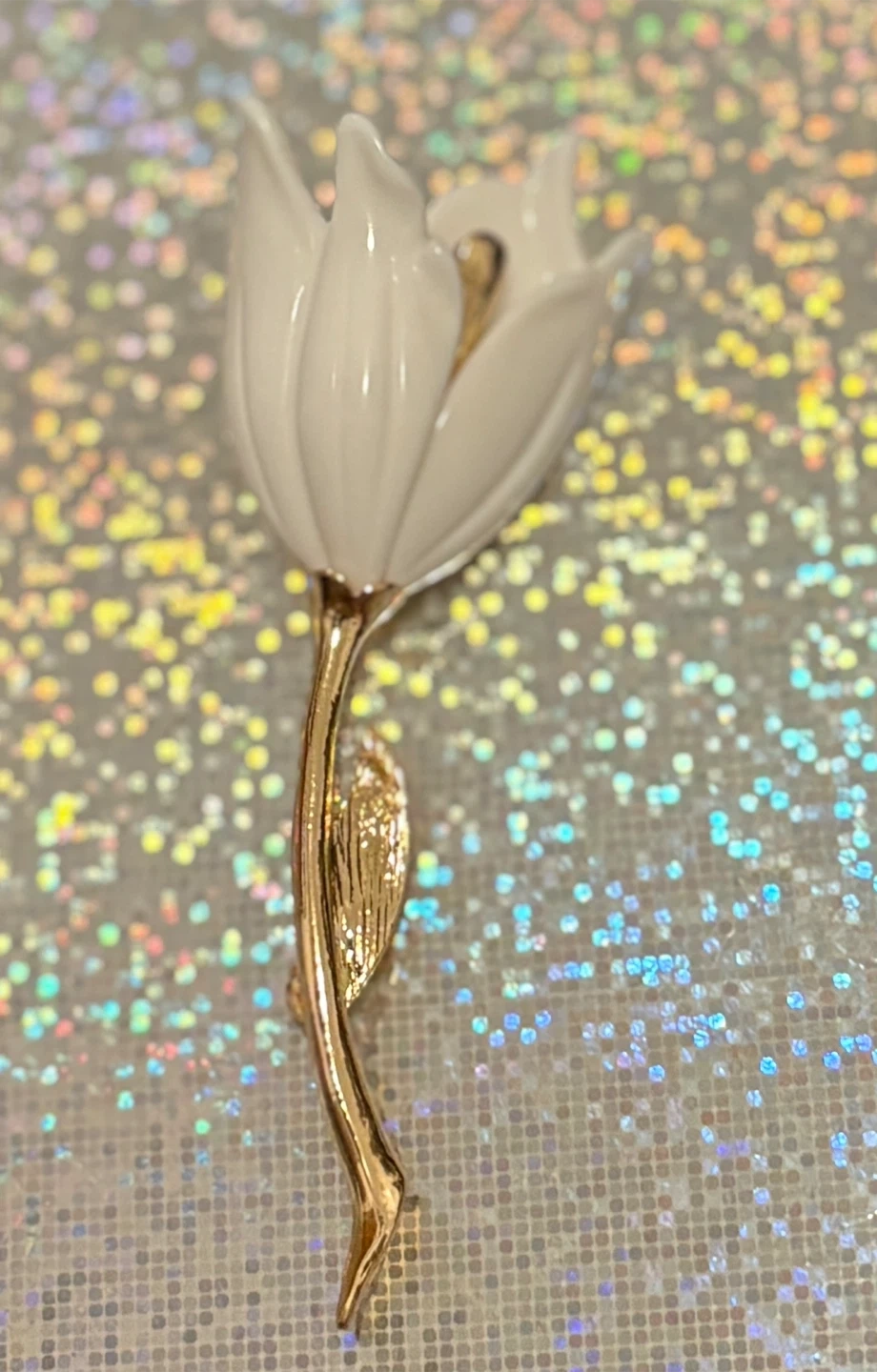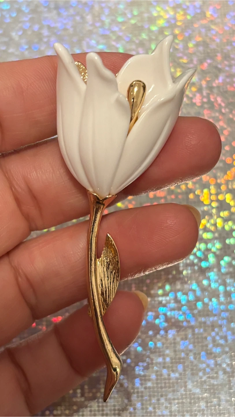 A beautiful white tulip-shaped brooch with gold-toned stem and leaf detail. It's a lovely accessory for any outfit. Gold-tone metal.