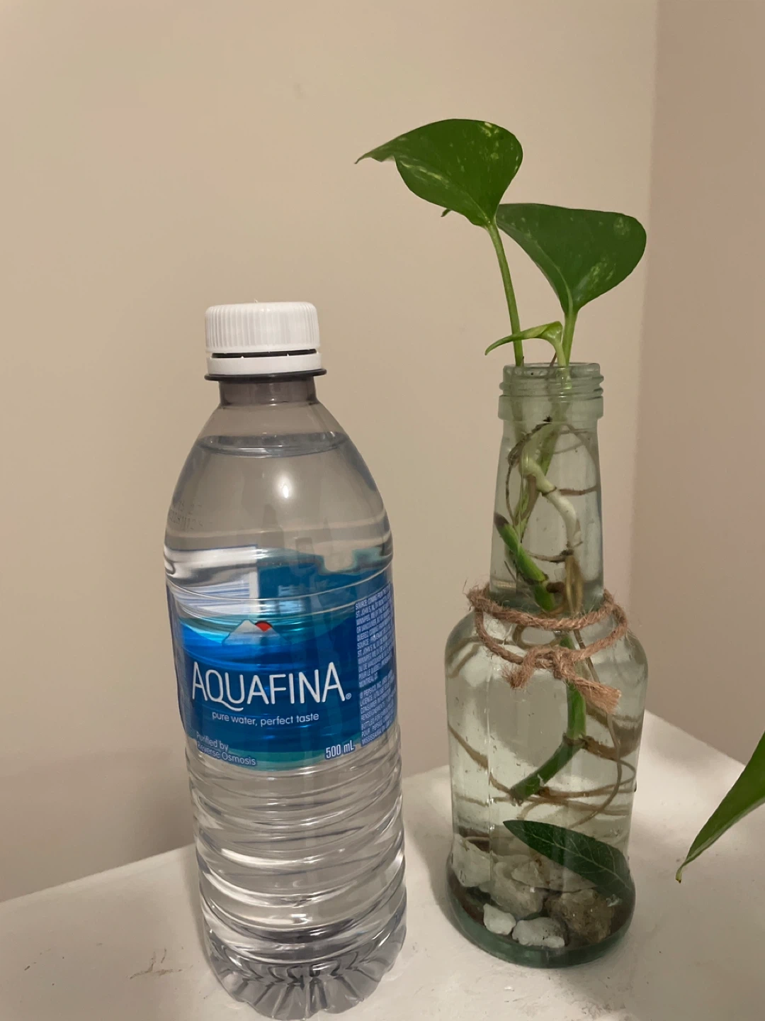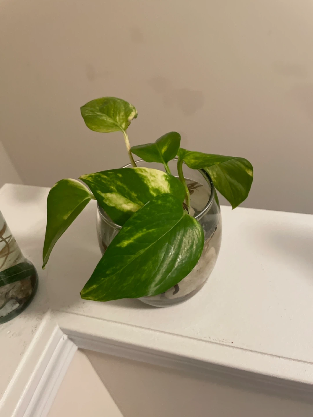 Pothos cuttings rooting in water. Each cutting is in a unique glass vase with stones. One vase is a clear bottle, the other is a rounded glass. Perfect for adding some greenery to your space!