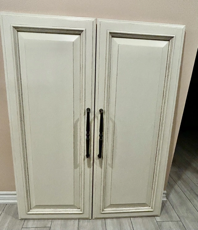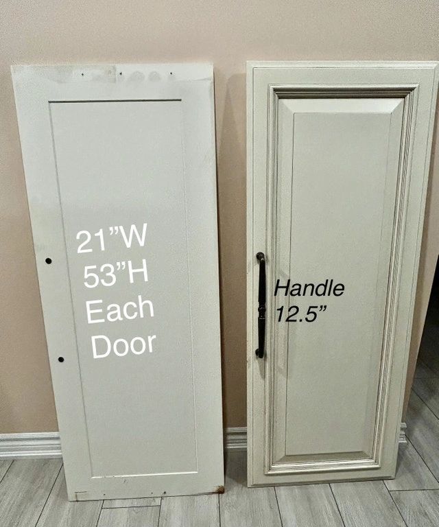 2 SOLID WOOD DOORS. Perfect for adding elegance to any space. Each door is 21W x 53H inches. Includes a 12.5-inch black metal handle. Solid wood construction. Fully ready to install or repaint to fit your space. Used - Good condition. Cash accepted.