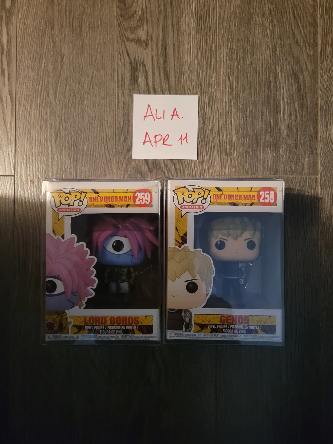 Two Funko Pop! vinyl figures from the anime One Punch Man. Includes Lord Boros (259) and Genos (258). These collectible figures come in their original boxes.