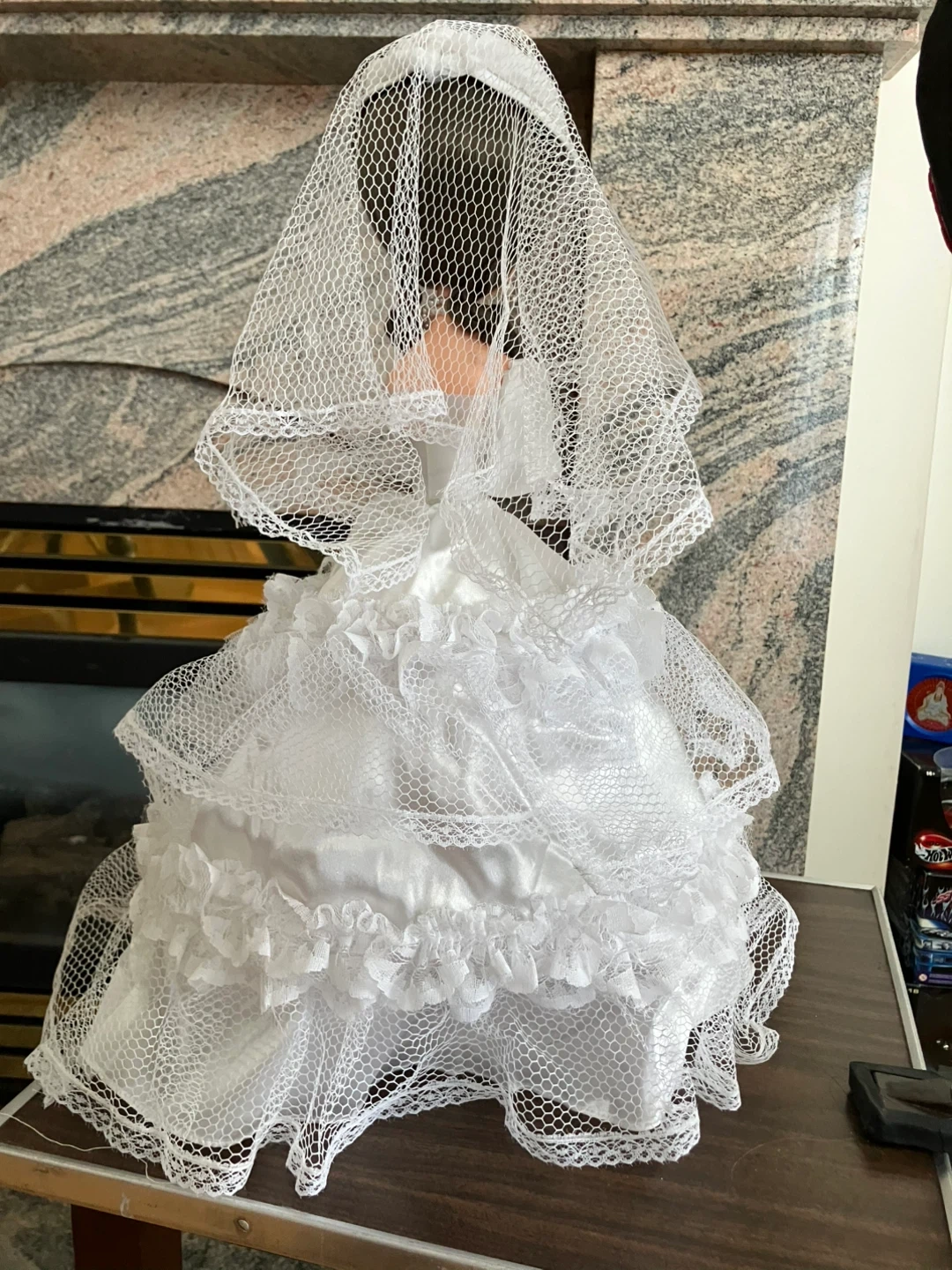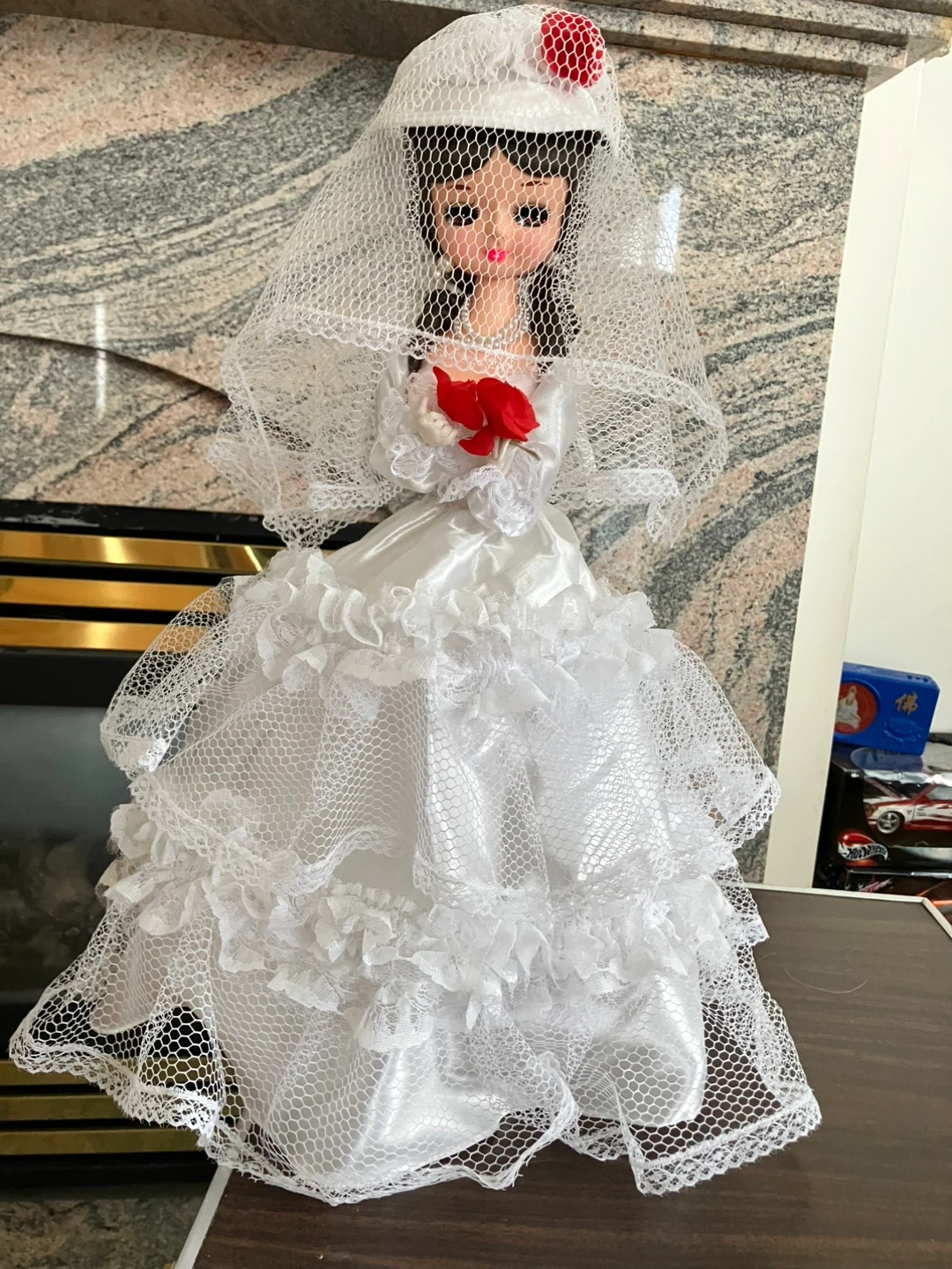 Public Meet Up-Open To Offers/CASH ONLY, This is a brand new vintage bride doll wearing a white wedding dress with lace and ruffles. It has a veil and a red accent on its hat and dress.