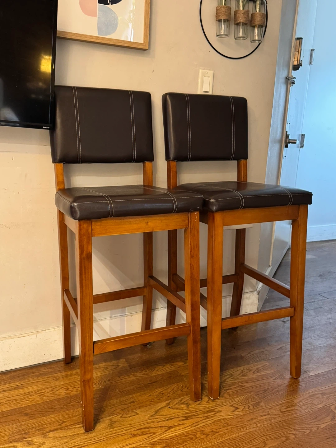 This set includes two bar stools with brown faux leather seats and backs. The wood frames offer a sturdy base. These stools are perfect for a kitchen island or home bar.